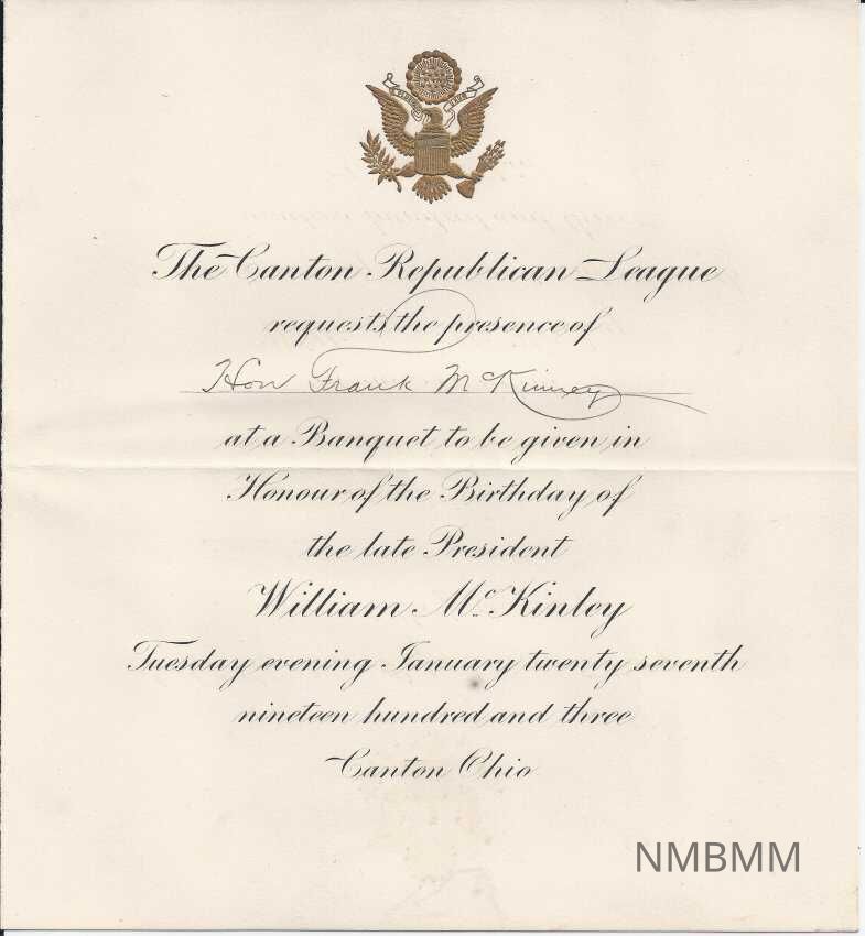 An invitation to Hon. Frank M. Kinney from the Canton Republican League to attend the Birthday of the late President William M. McKinley January 27, 1903.Collection