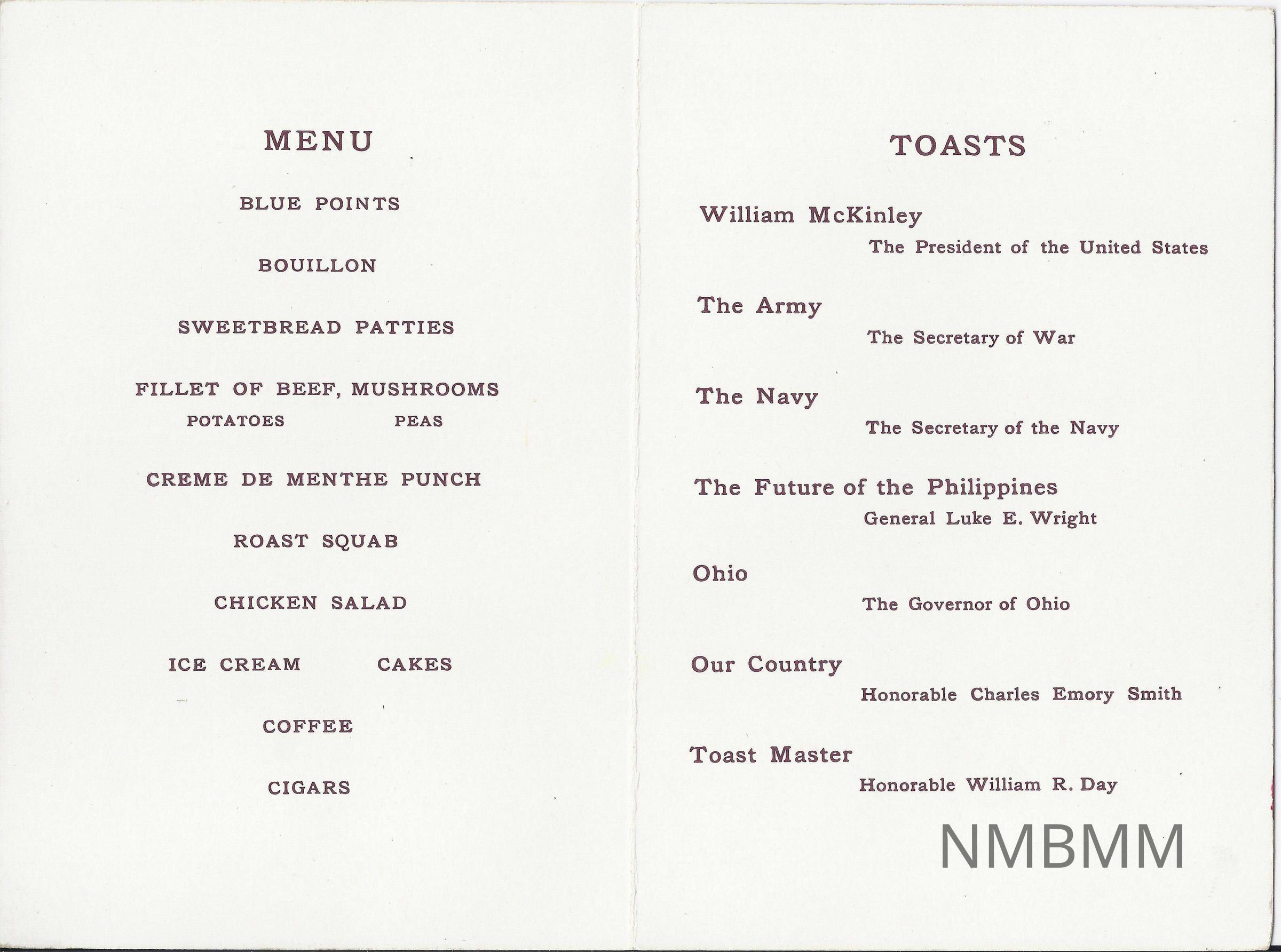A menu for the Canton Republican League Banquet in Honour of the Birthday of the Late President William McKinley. The menu includes a list of all the courses, desserts and includes cigars. It also has a page for the toasts.Collection
