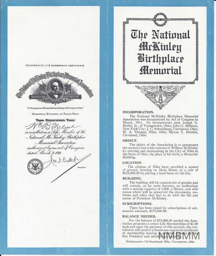 The pamphlet features information about the association, their object to build a memorial in Niles, OH, what the building will have and be made out of, and it asks for people to join for a life membership of $1.00 to help raise the balance of $75,000. Inside they have a copied letter of William R. Melish's request of membership for his wife, his son and himself. On the back on the pamphlet there is a copy of Melish's membership certificate.Collection