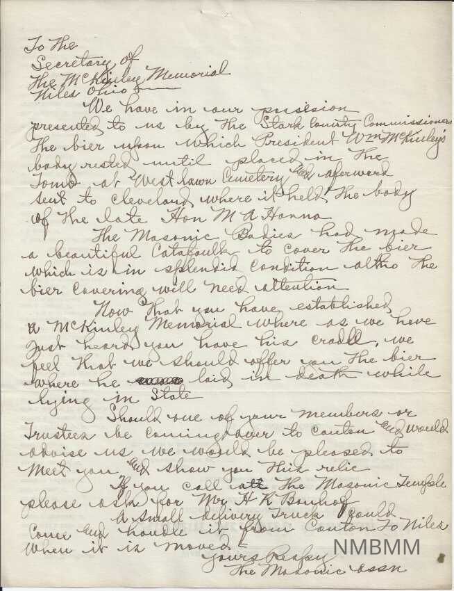 A letter from The Northern Masonic Jurisdiction, Valley of Cleveland to the secretary of the William McKinley Birthplace Association in Niles. The letter discusses the possibility of donating the bier that held both William McKinley and M.A. Hanna's bodies to the birthplace memorial in Niles.Collection
