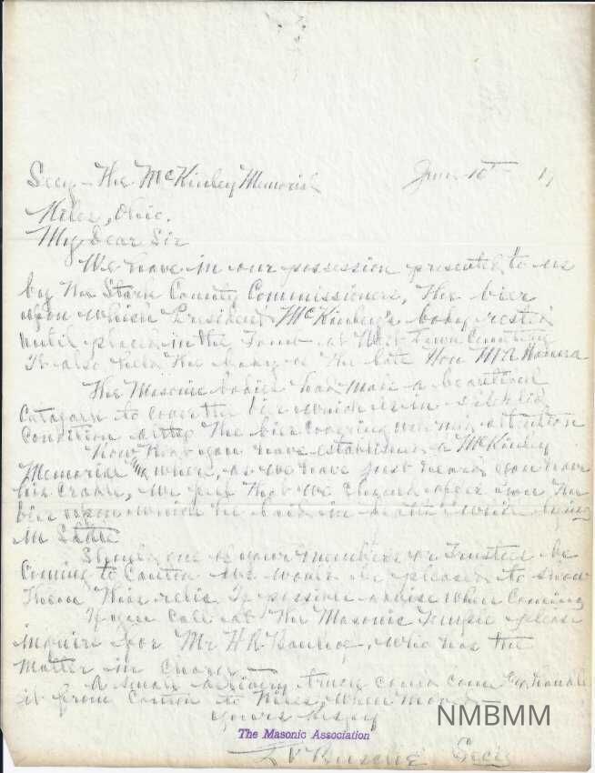 Letter from the Masonic Association the Valley of Cleveland to the William McKinley National Birthplace Association [Copy]Entry/Object ID