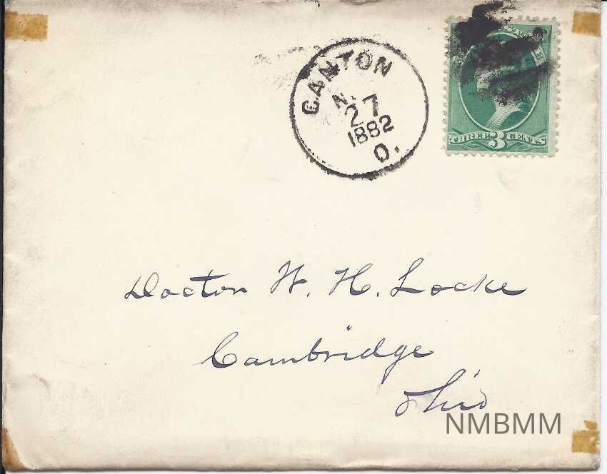 The envelope held the note giving regrets and congratulations to Mr. and Mrs. Abner McKinley. On the front of the envelope a postmark from Canton, Ohio from November 27, 1882 is featured. A three cent stamp is also featured. On the back of the envelope, a postmark is featured but not clearly legible. The time 8AM and the date of the 29th can be read.Collection