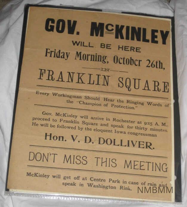 This item is a beige flier with black writing advertising Ohio Governor William McKinley's visit to Rochester, New York in Franklin Square. His visit is dated Friday, October 26th of an unknown year. After some research, the year can be determined as 1894. Governor McKinley was to arrive in Rochester at 9:15 am proceed to Franklin Square and speak for 30 minutes. Iowa Congressman V.D. Dolliver was to speak after him.Collection