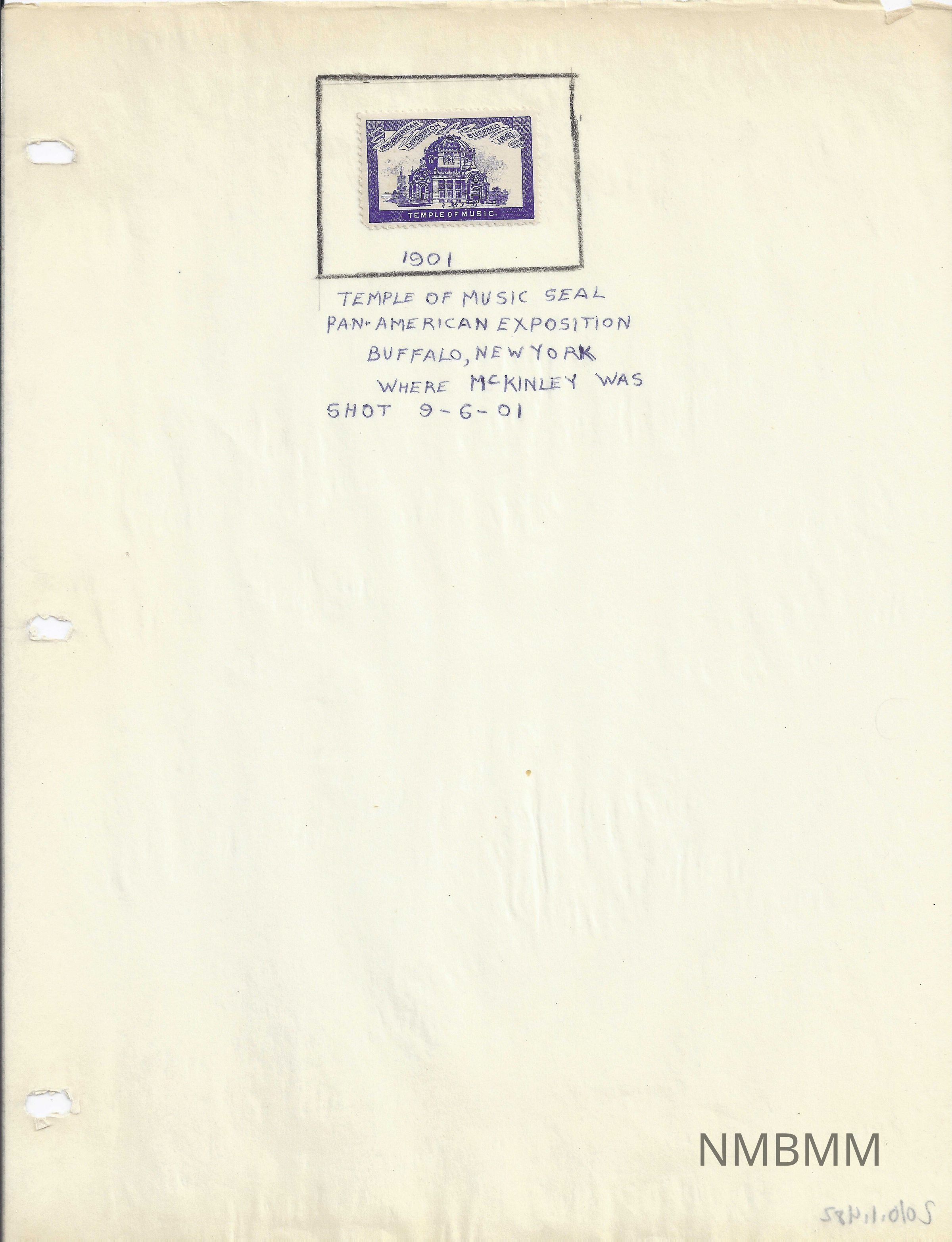 This is a stamp with a blue and white image of the Temple of Music from the Pan-American Exposition in Buffalo, New York where McKinley was shot.Collection