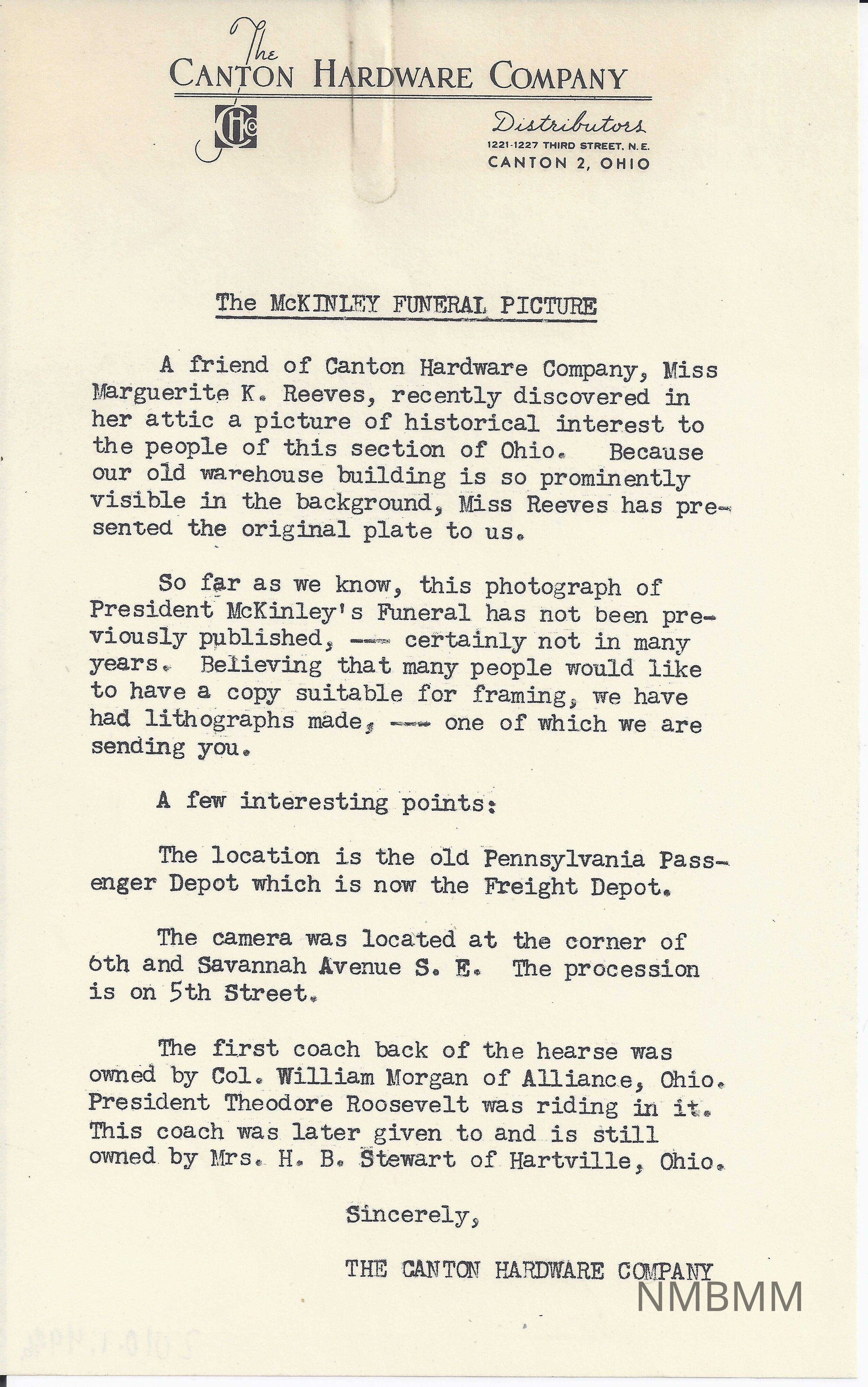 Letter from The Canton Hardware Company describing where the picture of the McKinley funeral procession originatedEntry/Object ID