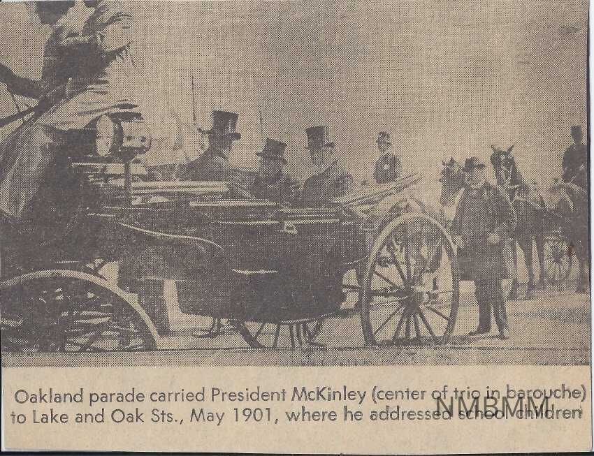 This is a newspaper clipping of a picture of McKinley sitting in a carriage along with three other men during a parade in Oakland. The caption reads "Oakland parade carried President McKinley (center in trio in barouche) to Lake and Okay Sts., May 1901, where he addressed school children." It is mounted on black paper.Collection