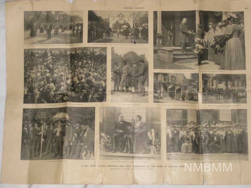 This is an insert inside a weekly magazine. The title is "A Day with Major McKinley, Our Next President, at His Home in Canton, Ohio. Photographs by J.C. Hemment. Copyrighted, 1896 by Leslie's Weekly" It features ten different black and white pictures of the daily activites of McKinley and various people visiting his home. 11 3/8" by 16 1/4"