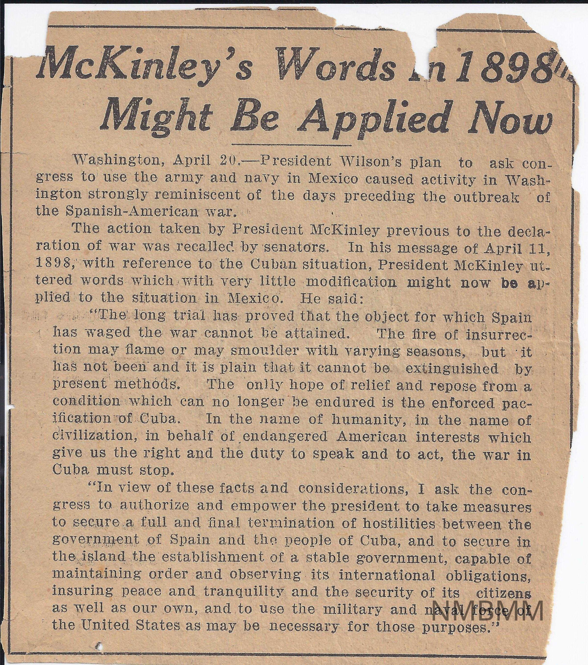 This is a newspaper clipping about President Wilson speaking to Congress about using the army and navy in Mexico. McKinley used similar words during his presidency. It is entitled "McKinley's words in 1898 Might be Applied Now". It features a quote of President McKinley's from when he addressed congresson Aprill 11, 1898.Collection