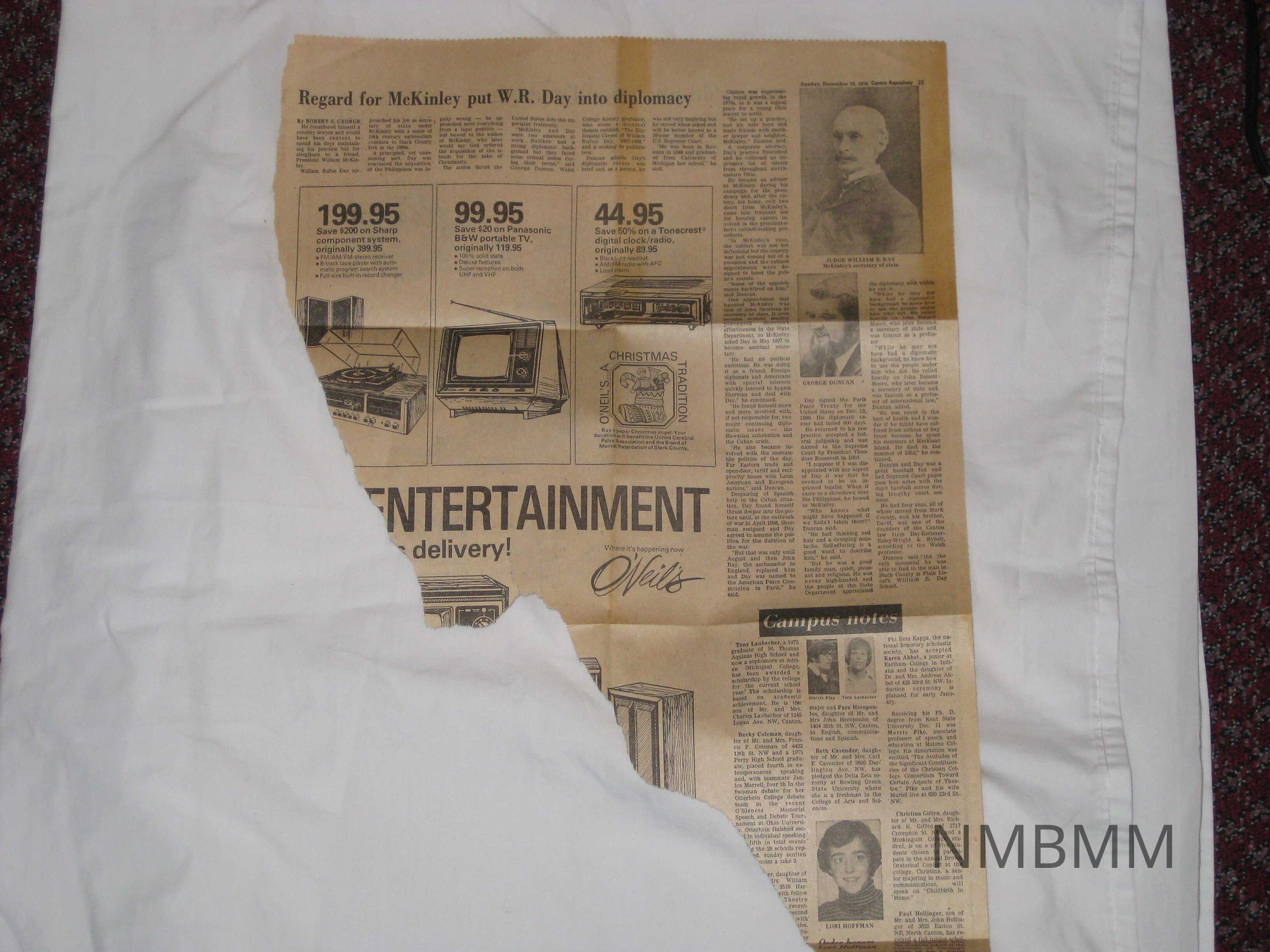 This is a newspaper clipping from the Canton Repository entitled "Regard for McKinley pur W.R. Day into Diplopmacy." Written by Robert S. George, it describes how W.R. Day came into the position as McKinley's Secretary of State and his influence while he held his position. Measures 14.5" by 23.25"Collection