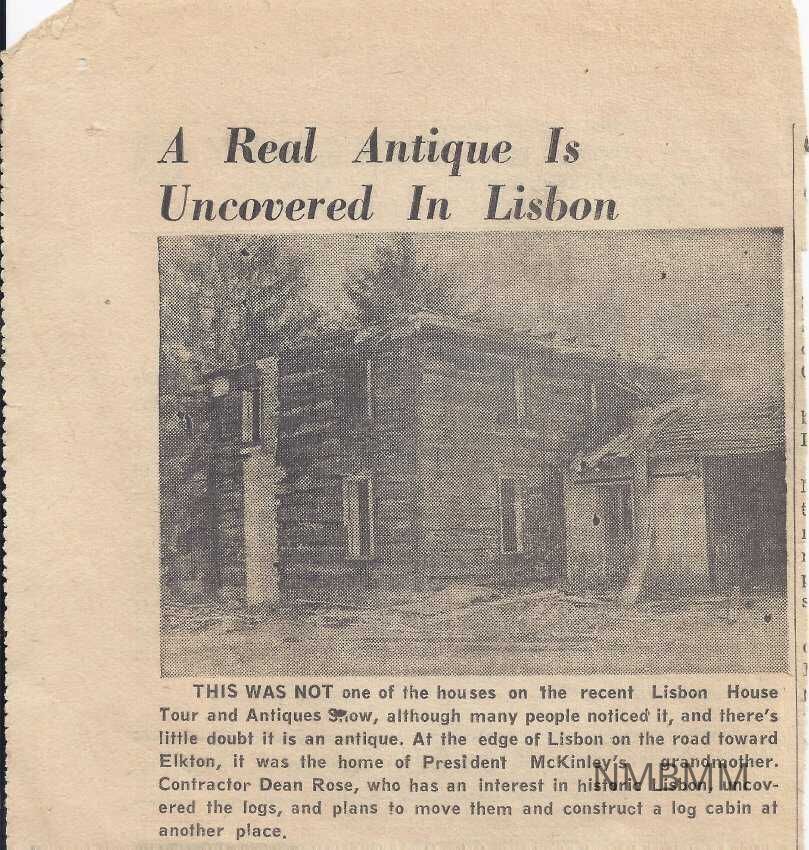 Newspaper clipping of President McKinley's grandmother's log cabin discovered in Lisbon, Ohio. Title reads " A Real Antique is Uncovered in Lisbon."