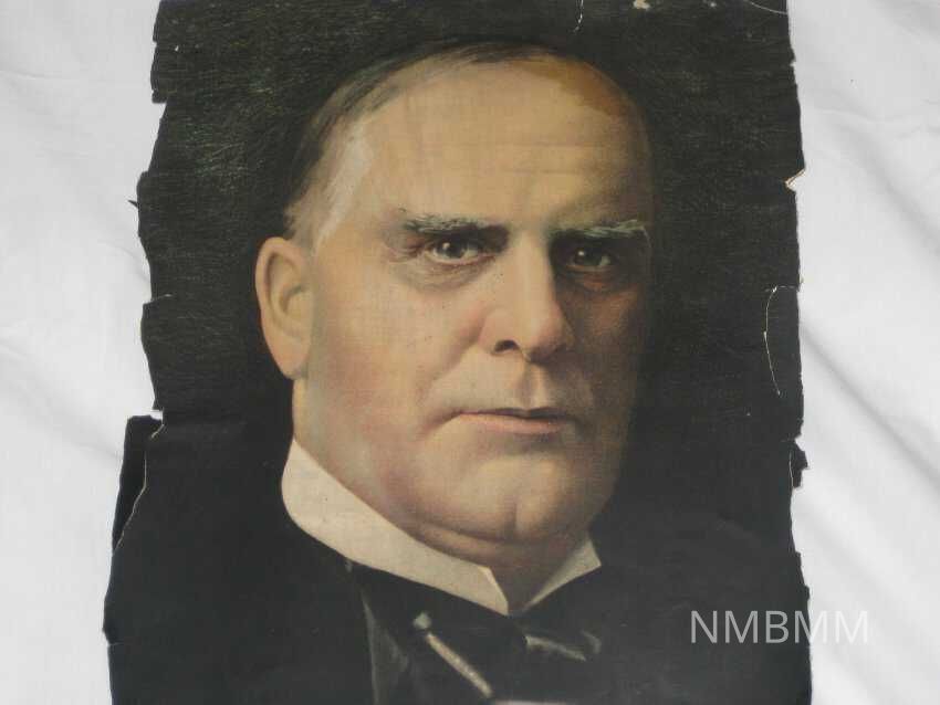 This is a color portrait of President McKinley on a black background. The paper is badly torn and creased. Measures 12" by 10".