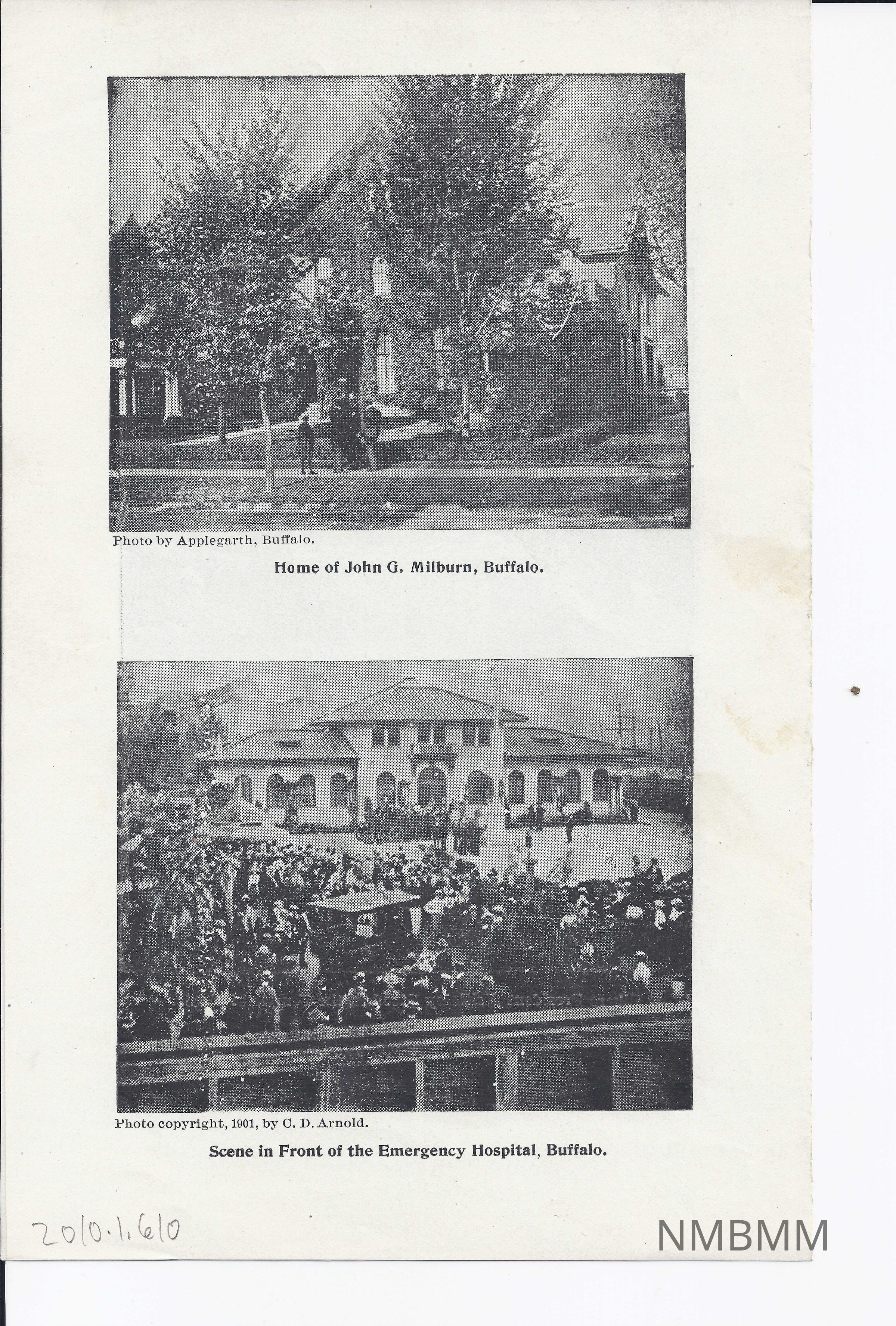 This is a supplement from the Canton Repository. The front has an image of The Temple of Music on the Pan-American Exposition Grounds. The inside has images of the catafalque in the Capitol Rotunda at Washington and the spot where President McKinley stood in the Temple of Music. The last page has images of the home of John G. Milburn and the front of the emergency hospital in Buffalo, New York.Collection