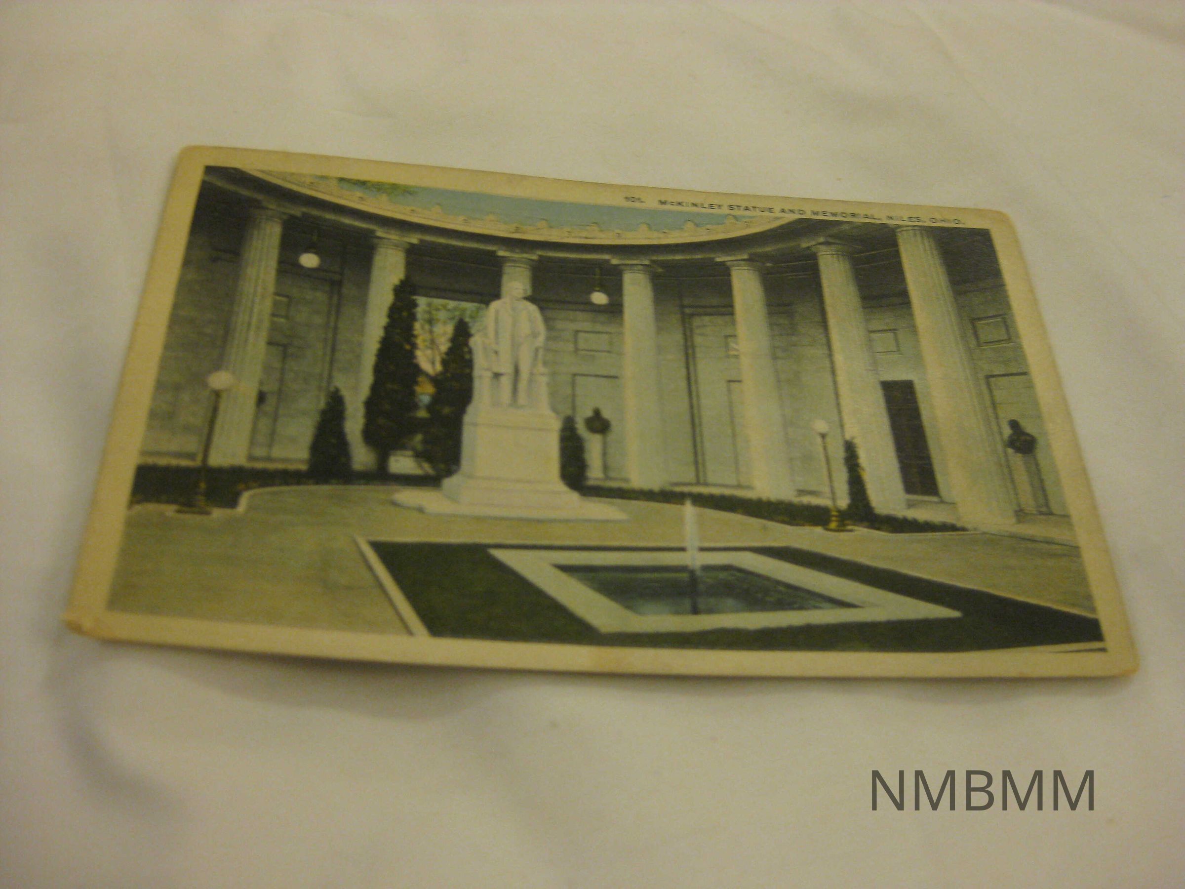 This item is a postcard with a color image of the McKinley statue and Memorial in Niles, Ohio. 5.5 by 3.5 inches. Publisher listed on back, Progressive News Co. , Toledo, Ohio. Back side text, "We are having a dandy time. Visited all the parks. Going to Warren this evening. Grace." Addressed to "Mrs. M.H. Kohler 37 Burton St. Massillon, O."Collection