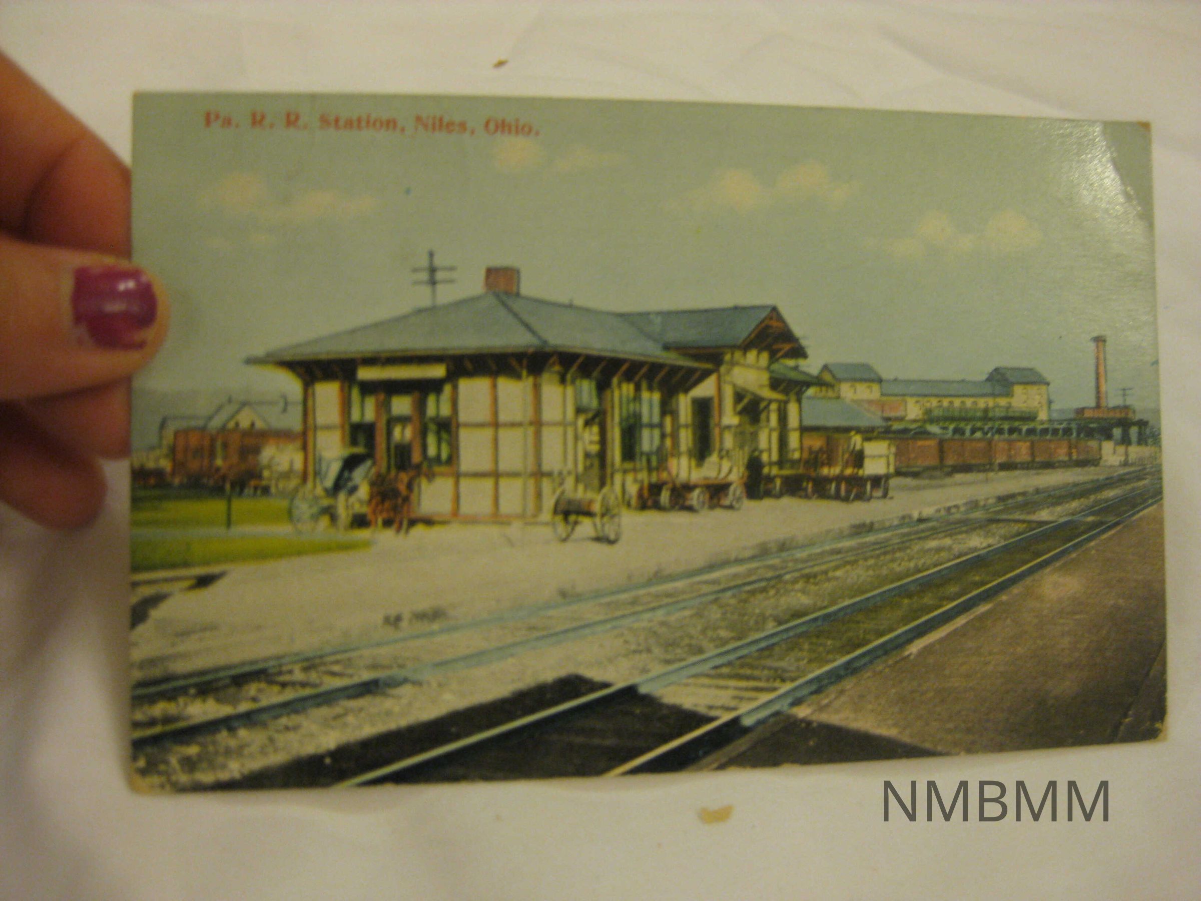 This item is a postcard with a color image of Pa. R.R. Station, Niles, Ohio. 5.5 by 3.5 inches. Publisher listed on back, Kennedy & Ferguson, Prescription Druggists. Addressed to "Mrs. Wm Hillman Baden, Pa. R.F.D. #2." Text, "A vacation at last. With love from Your friend Elizabeth Burry." One cent green postage stamp. Ink Stamp Mineral Ridge Ohio.