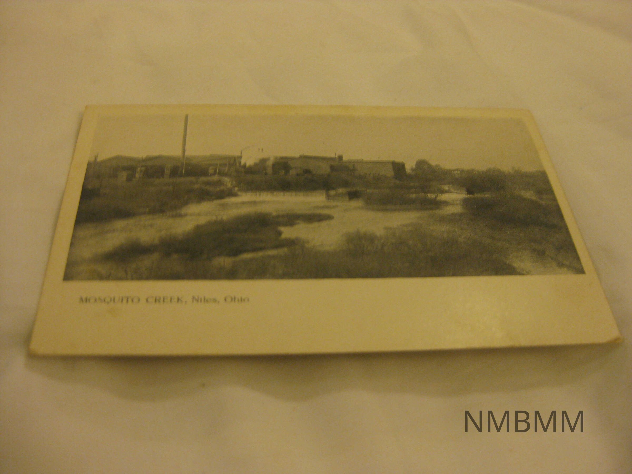 This item is a postcard with a black and white image of Mosquito Creek in Niles, Ohio. 5.5 by 3.5 inches.