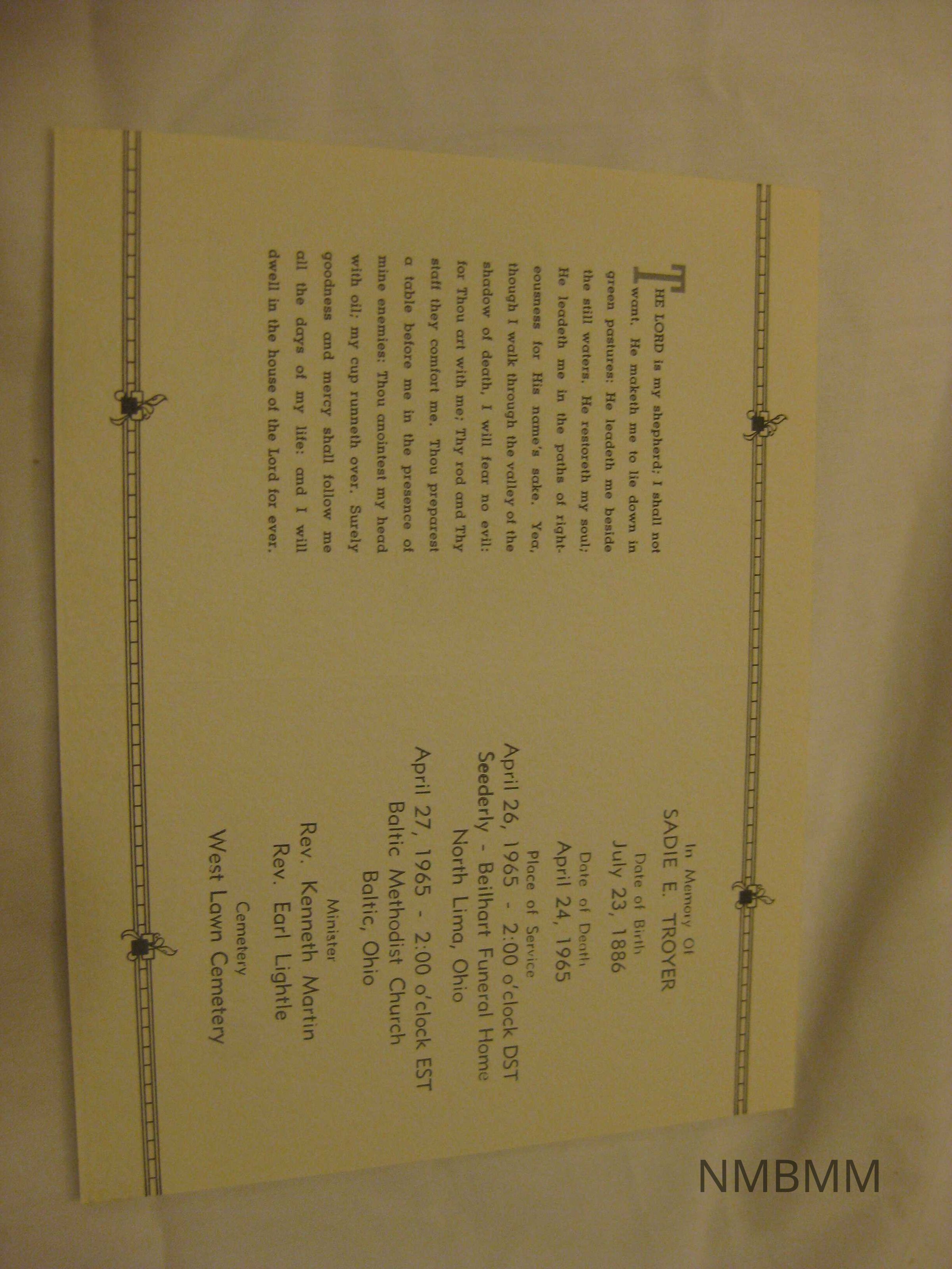 This item is a beige in memorial pamphlet for Sadie Troyer. Thw front features a picture of a church with the words, "In Memory." The inside features religious text along with biographical information and funeral services information. Produced by Seederly-Beilhart Funeral Homes. Color images. Black text.Collection