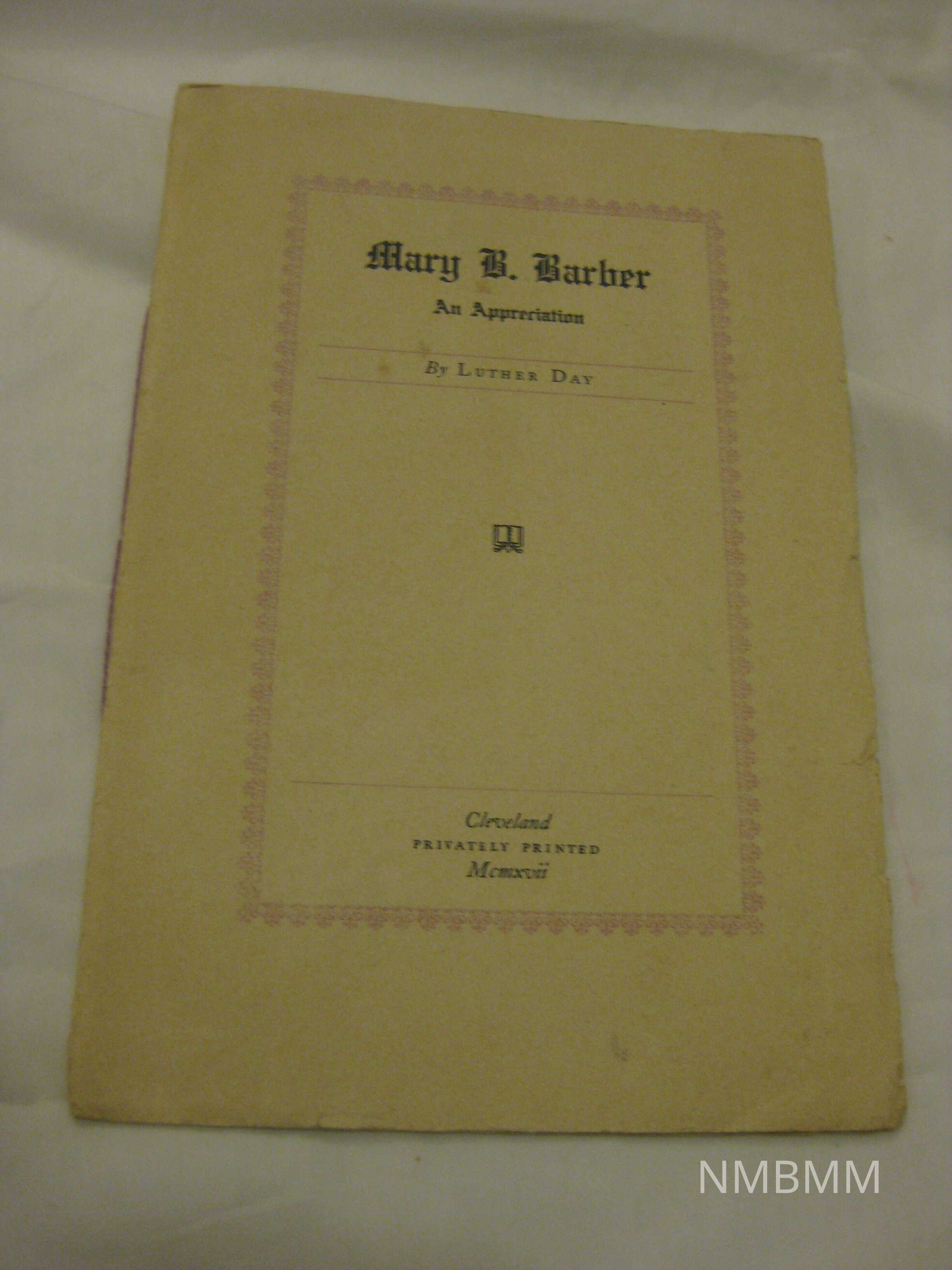 This item is a beige small booklet containing an appreciation essay of the life of Mary B. Barber written by Luther Day. The essay was privately printed in Cleveland. Black text. Mary lived 1848-1917.