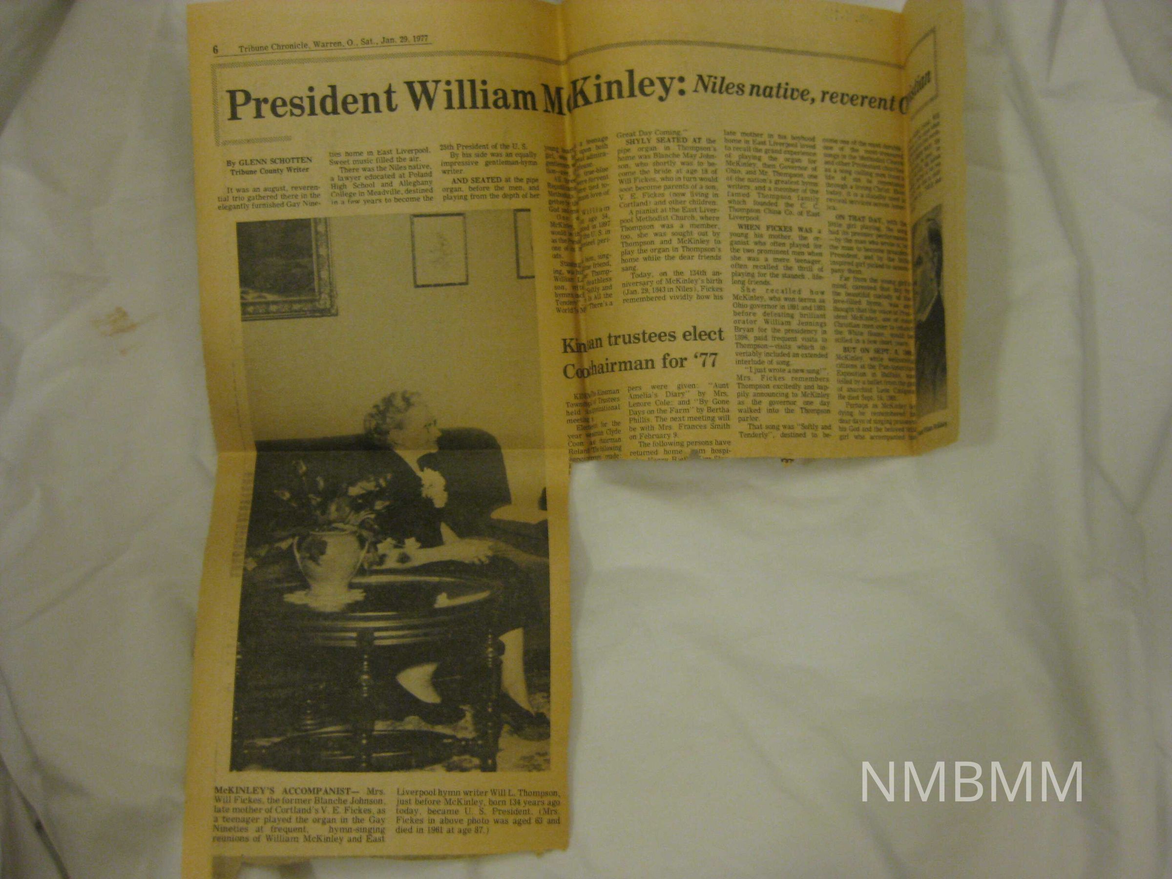 The item is a newspaper clipping of an article written by Glenn Schotten on President McKinley in the Tribune Chronicle, Warren, O on Jan. 29, 1977. The article discusses religion and hymns and President McKinley's life.Collection
