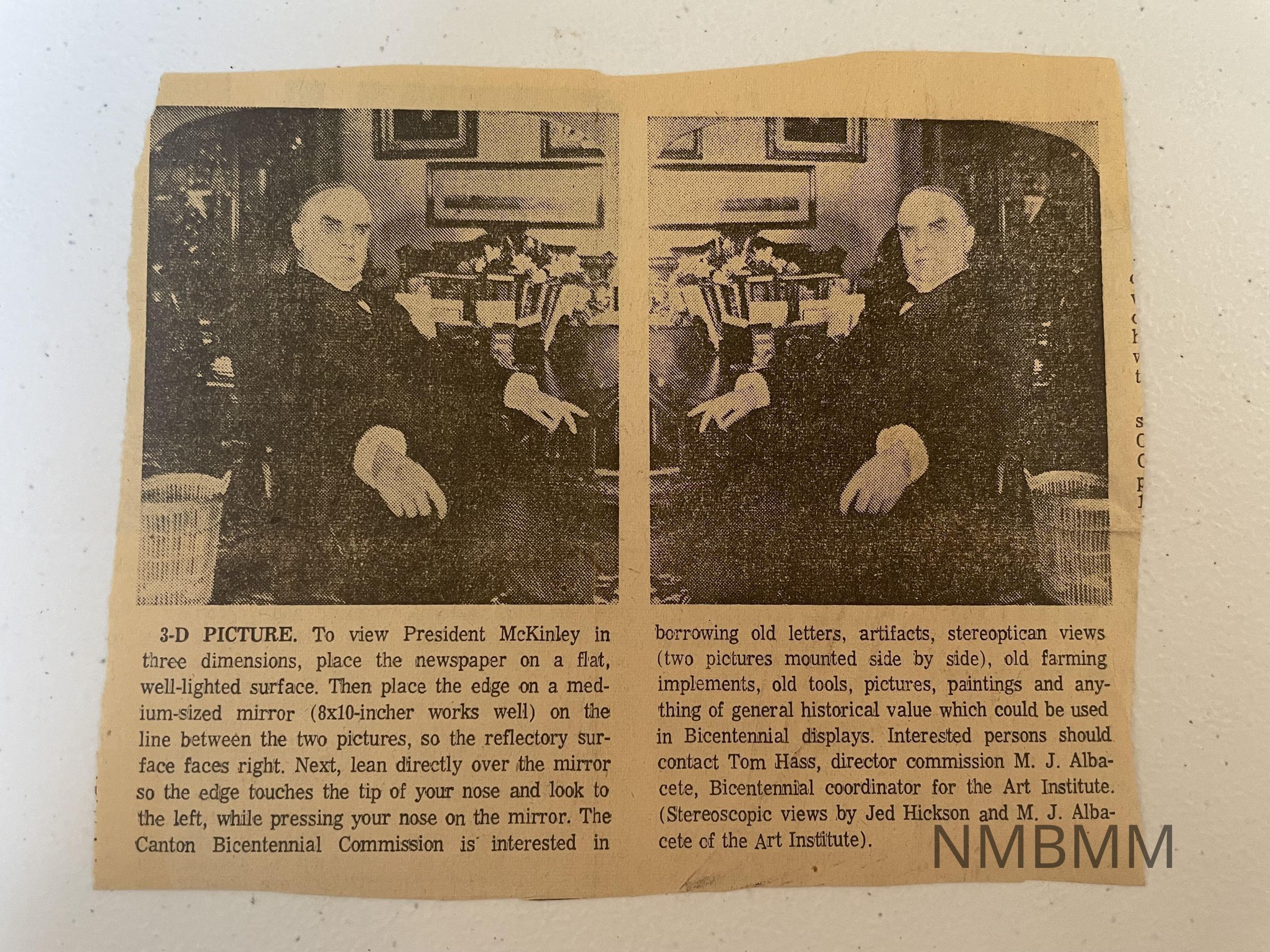 This is a newspaper clipping that features a 3-D Picture of President McKinley. It gives instructions on how to view the image in a mirror. It also asks for loans for a bicentennial display.Collection