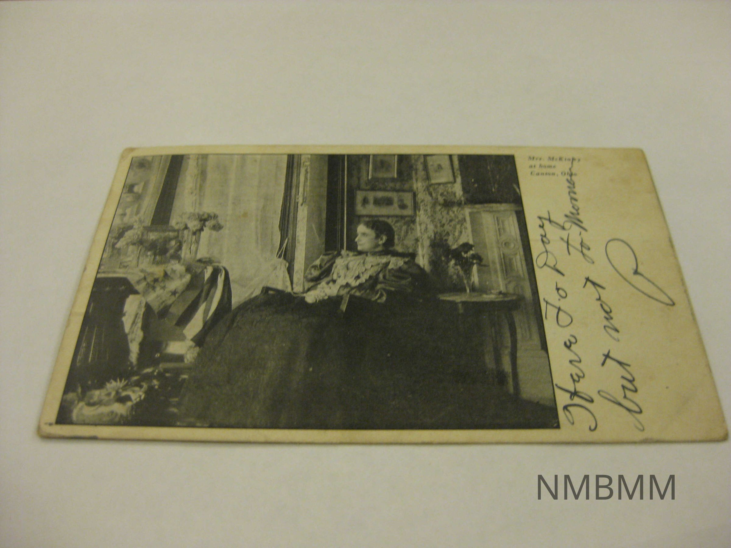 This item is a postcard with a photo of Ida McKinley sitting at her home in Canton, Ohio. The Roller Printing and Paper Co., Canton, Ohio- No. 2 On the front, on the right hand side, is written the words "HAve today but not to-morrow."Collection