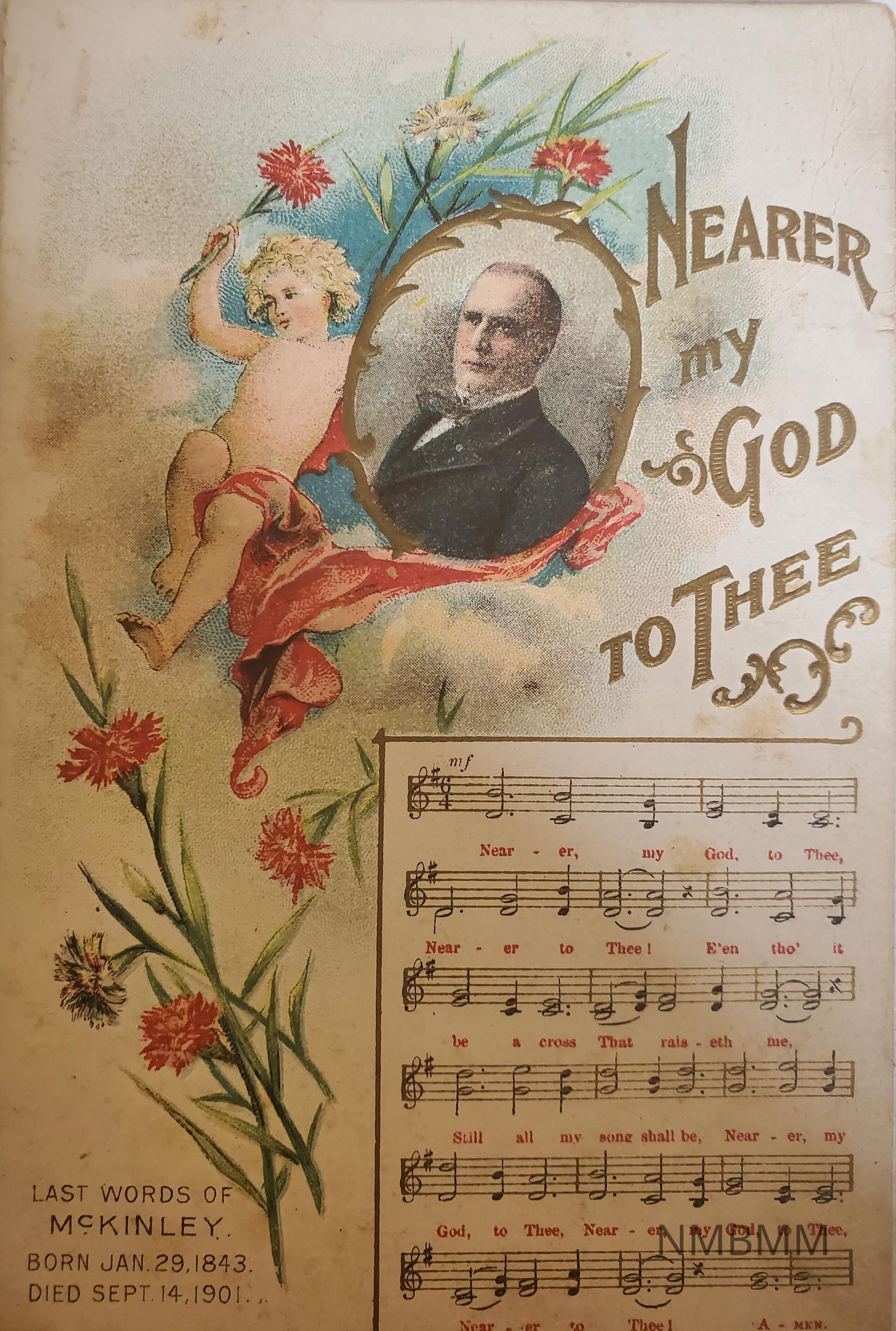 Postcard with one colored image of President McKinley, an image of a sheet of music, an angel, and flowers. The text says, "Nearer my God to Thee", "Last Words if McKinley Born Jan. 28, 1843. Died Sept. 14, 1901." The sheet of music image features lyrics to the song Nearer my God to Thee."