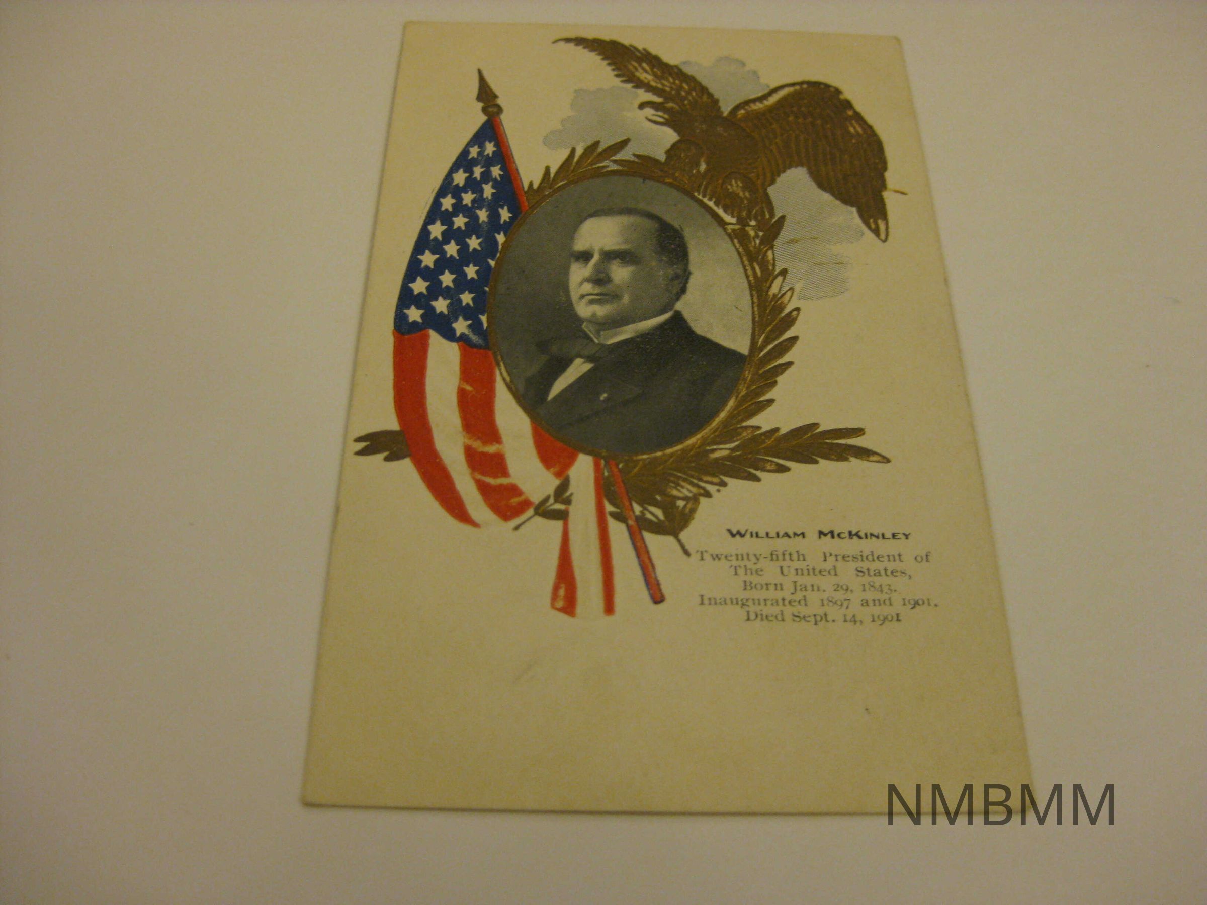 This item is a postcard with one black and white portrait of President McKinley in an oval. The portrait is surrounded by a gold eagle and olive branches and an American flag. The text written on the front of the post card says, "William McKinley Twenty-fifth President of The United States, Born Jan. 29, 1843. Inaugurated 1897 and 1901. Died Sept. 14, 1901."