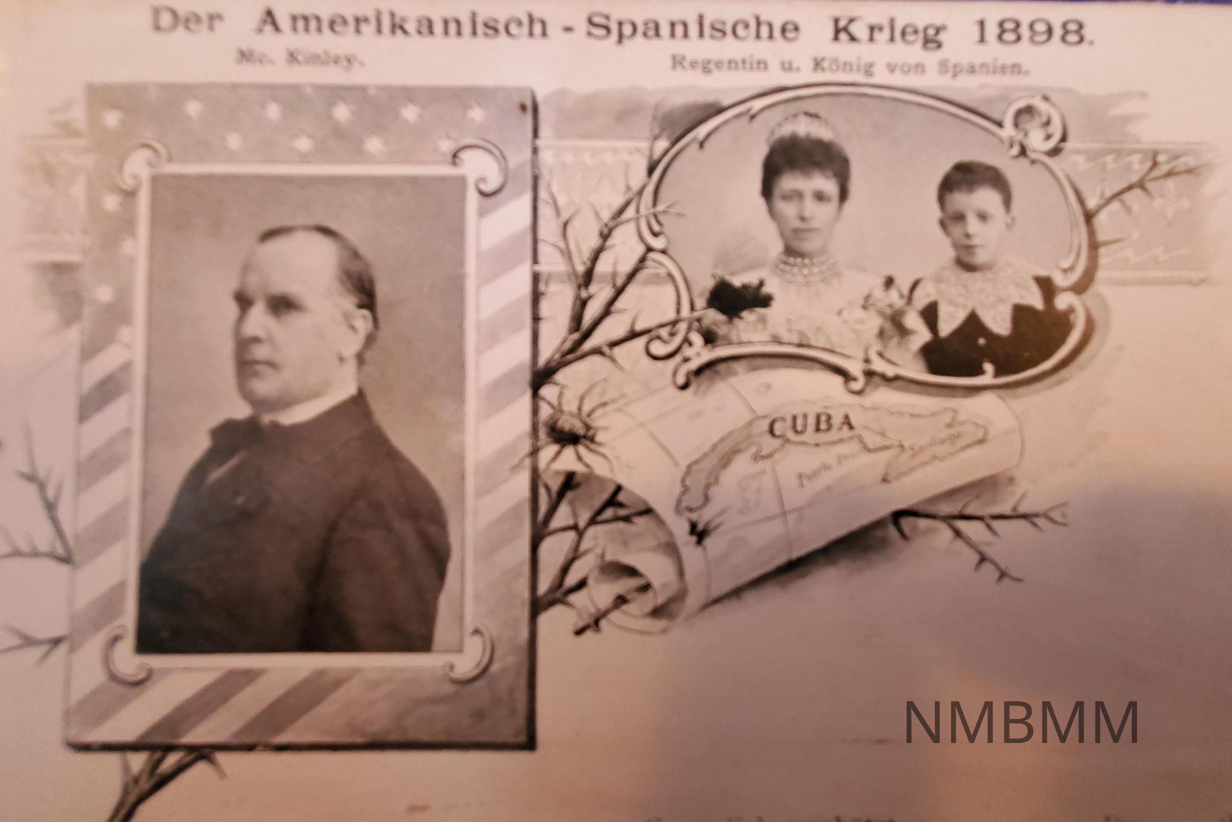 Postcard with a photo of President McKinley with a portrait of the Spanish Royal family, and a map of Cuba. The title reads "Der Amerikanisch- Spanische Krieg 1898."Collection