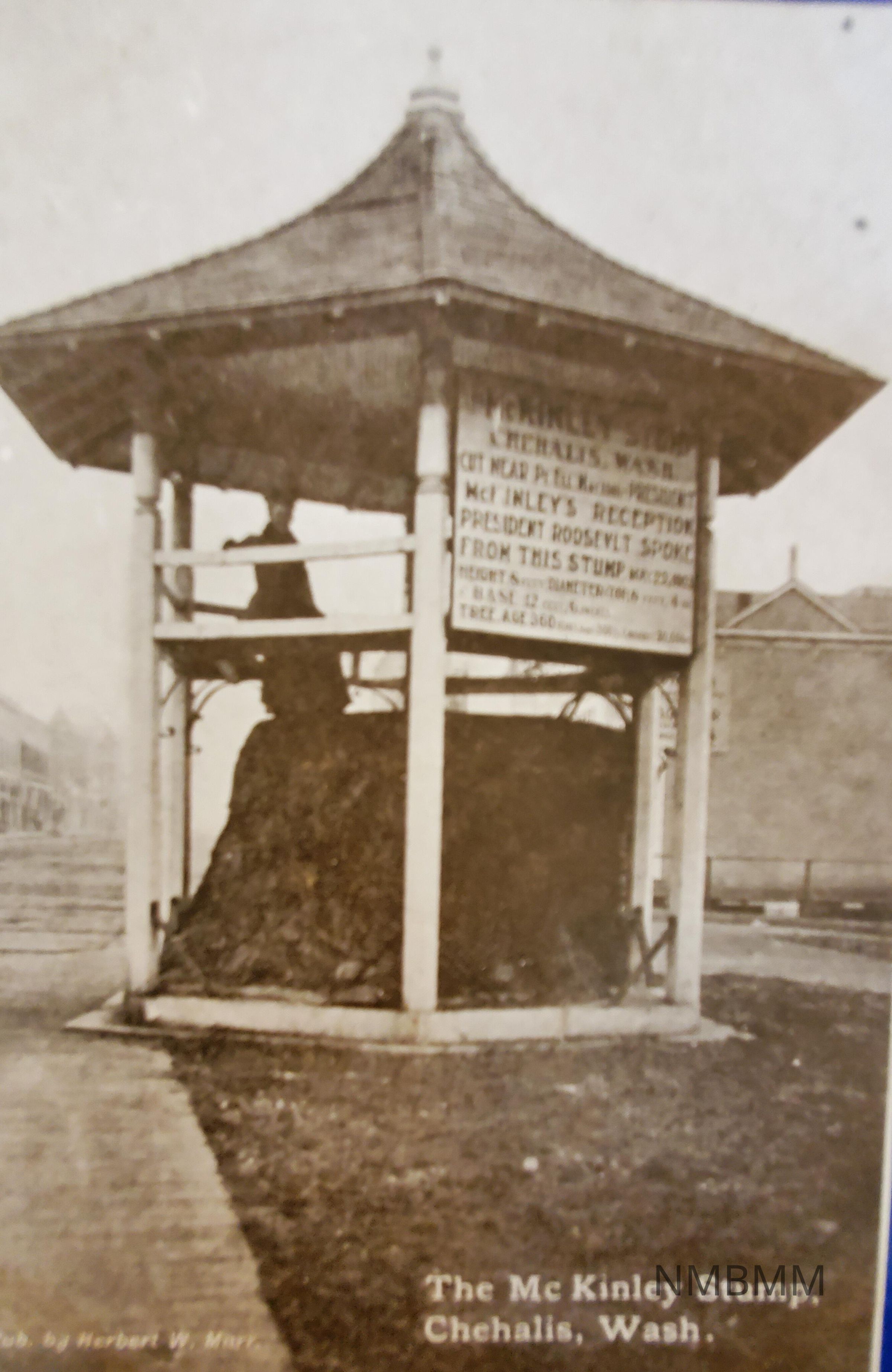 Postcard with a photo of the McKinley Stump in Chehalis, Washington. The sign on the stump says that President Roosevelt spoke from the stump on May 22,1903. United Art Publishing Company, New York City. Published by Herbert W. Marr.
