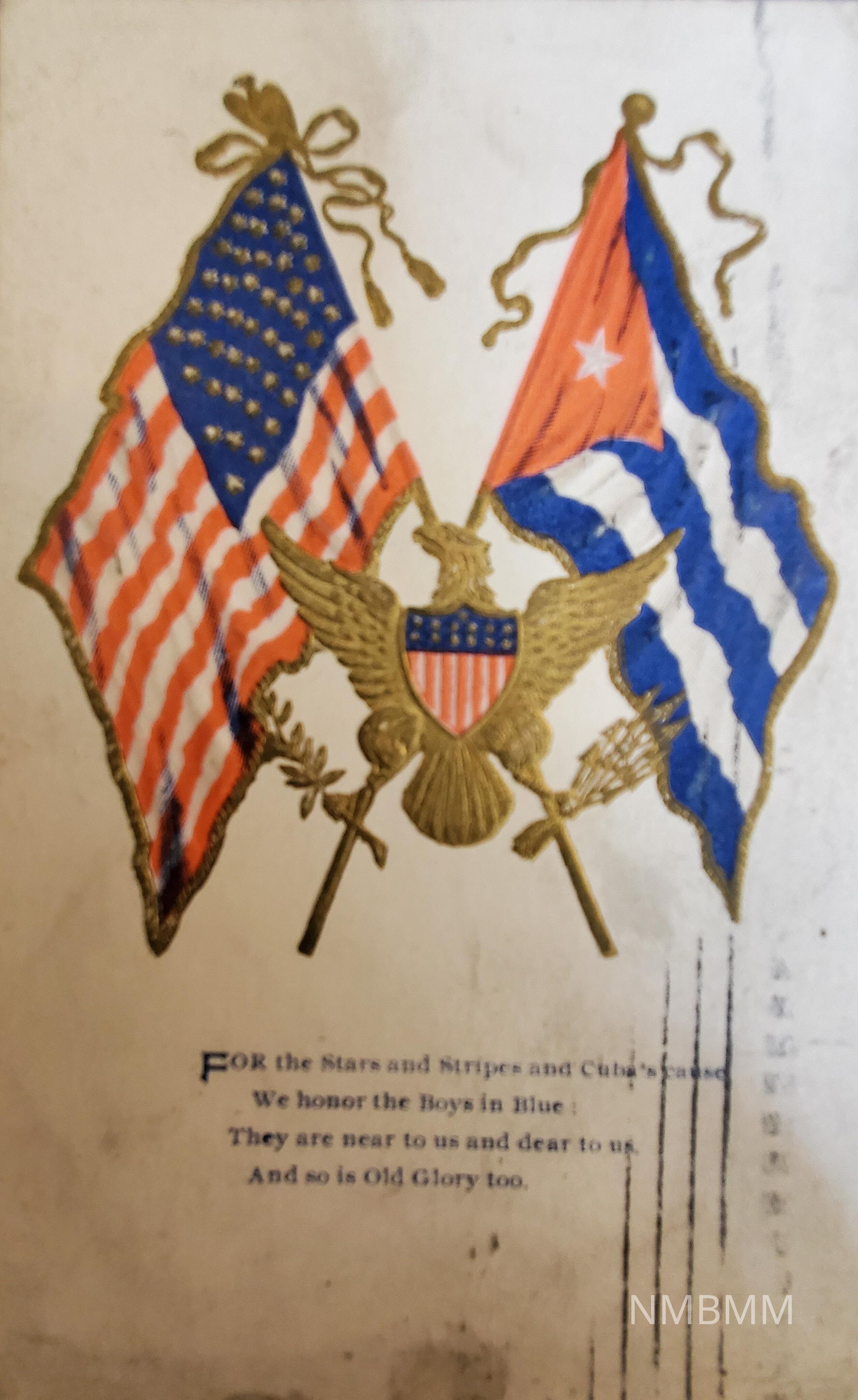 Postcard with a Cuban and an American flag relief surrounding a golden eagle. Below the flags read: "For the Stars and Stripes and Cuba's cause. We honor the Boys in Blue: They are near to us and dear to us. And so is Old Glory too. Published by The Milton H. Smith Co., Rochester, N.Y.Collection