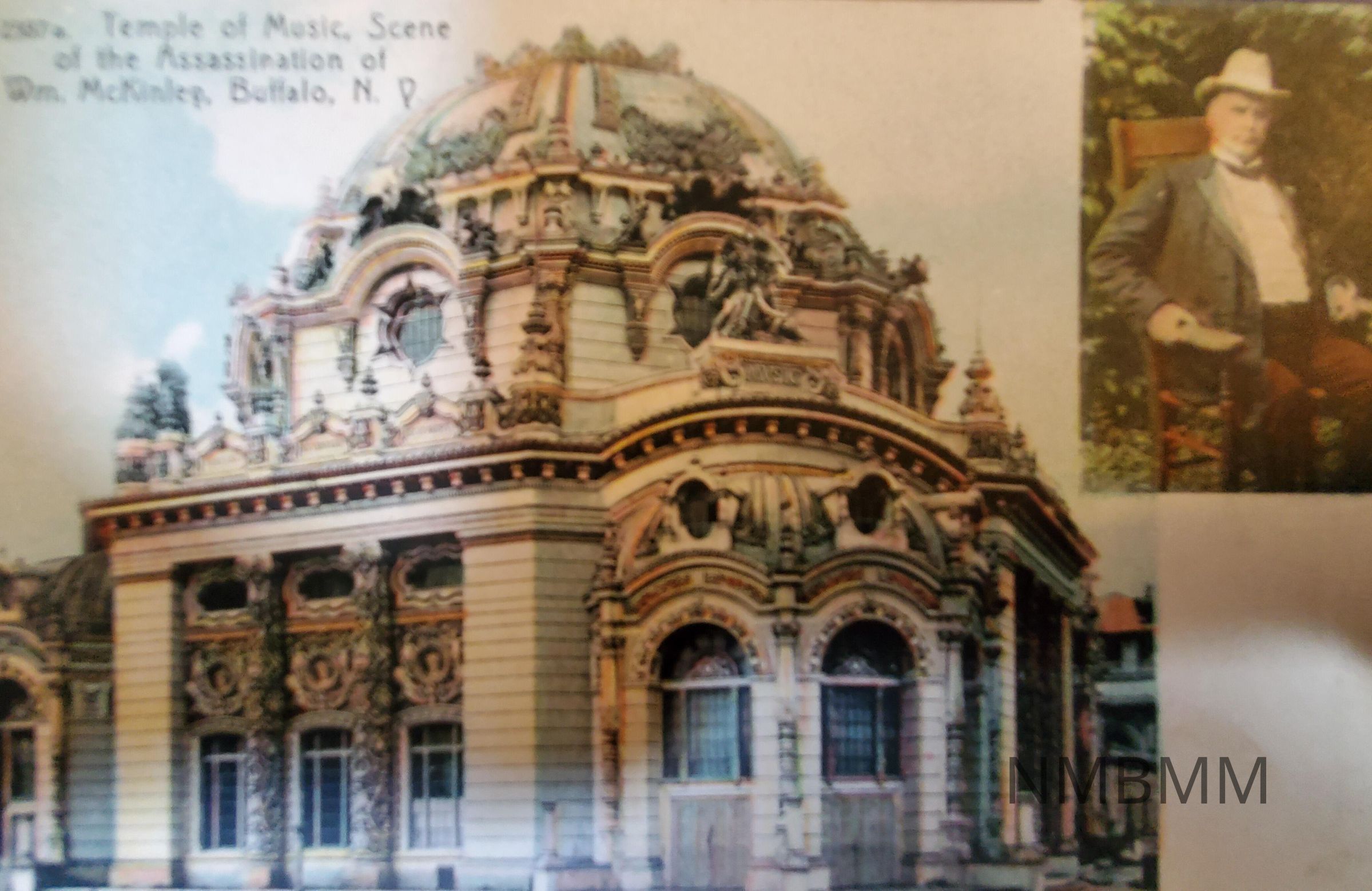 Postcard with a portrait of the Temple of Music in Buffalo, NY, at the Pan-American Exposition with a portrait of President McKinley sitting in the upper right hand corner. The building was where President McKinley was shot on September 6th, 1901.Collection