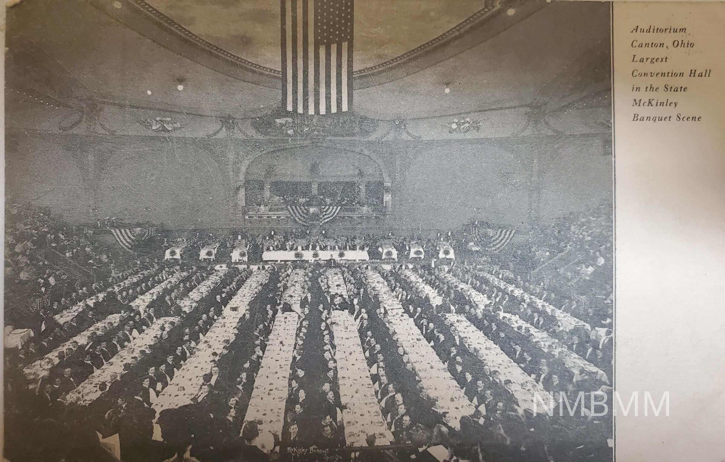 Postcard with a black and white image of the McKinley Banquet in Canton, Ohio. It has the caption, Auditorium Canton, Ohio Largest Convention Hall in the State McKinley Banquet Scene.Collection