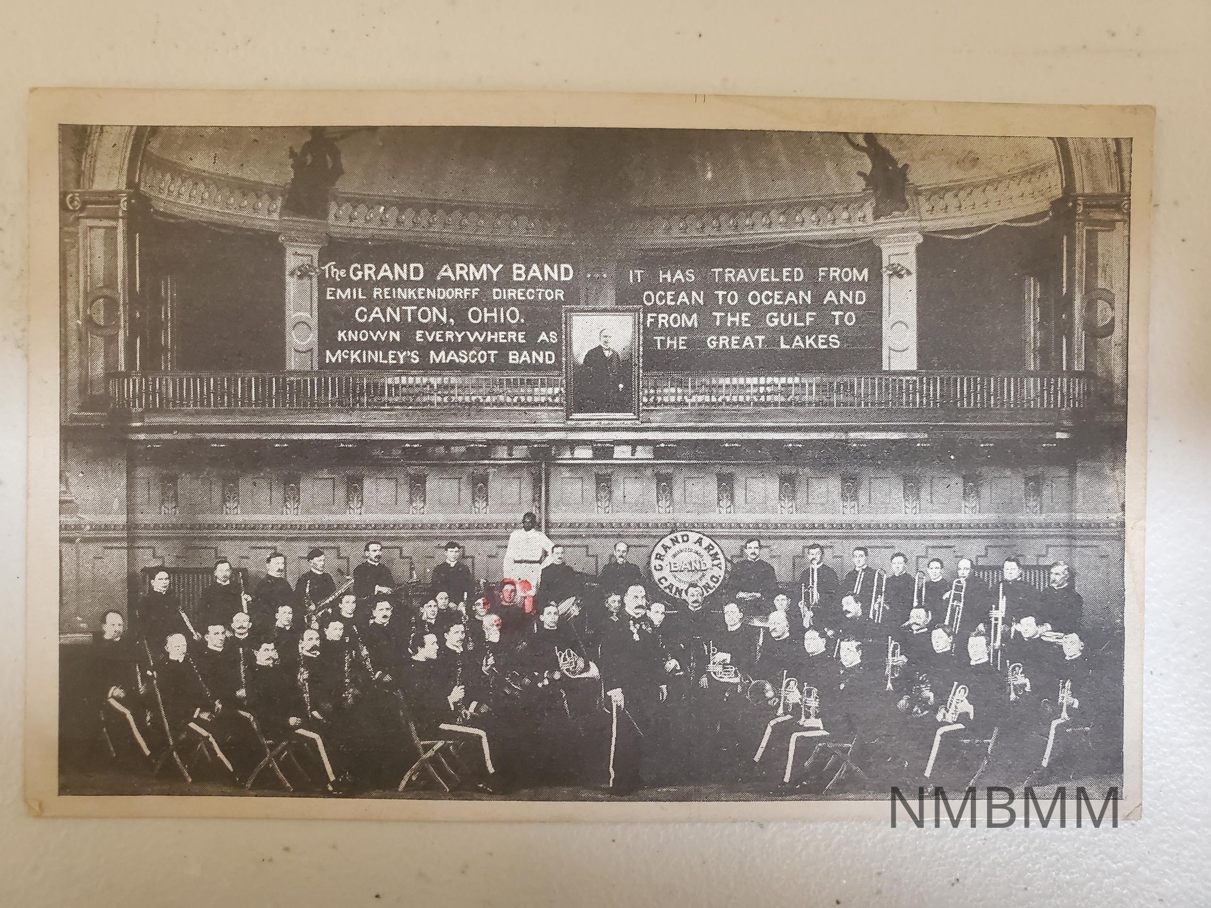 Postcard with a black and white image of the Grand Army of the Republic Band of Canton, Ohio. Text, "The Grand Army Band Emil Reinkendorff Director Canton, Ohio. Known Everywhere as McKinley's Mascot Band It has traveled from ocean to ocean and from the Gulf to the Great Lakes. Back written text, "Hows my Sweetheart today Lots of Love Jno. Chapman Miss Nettie Burton 704 Amelia St. Fredericksburg, Va."