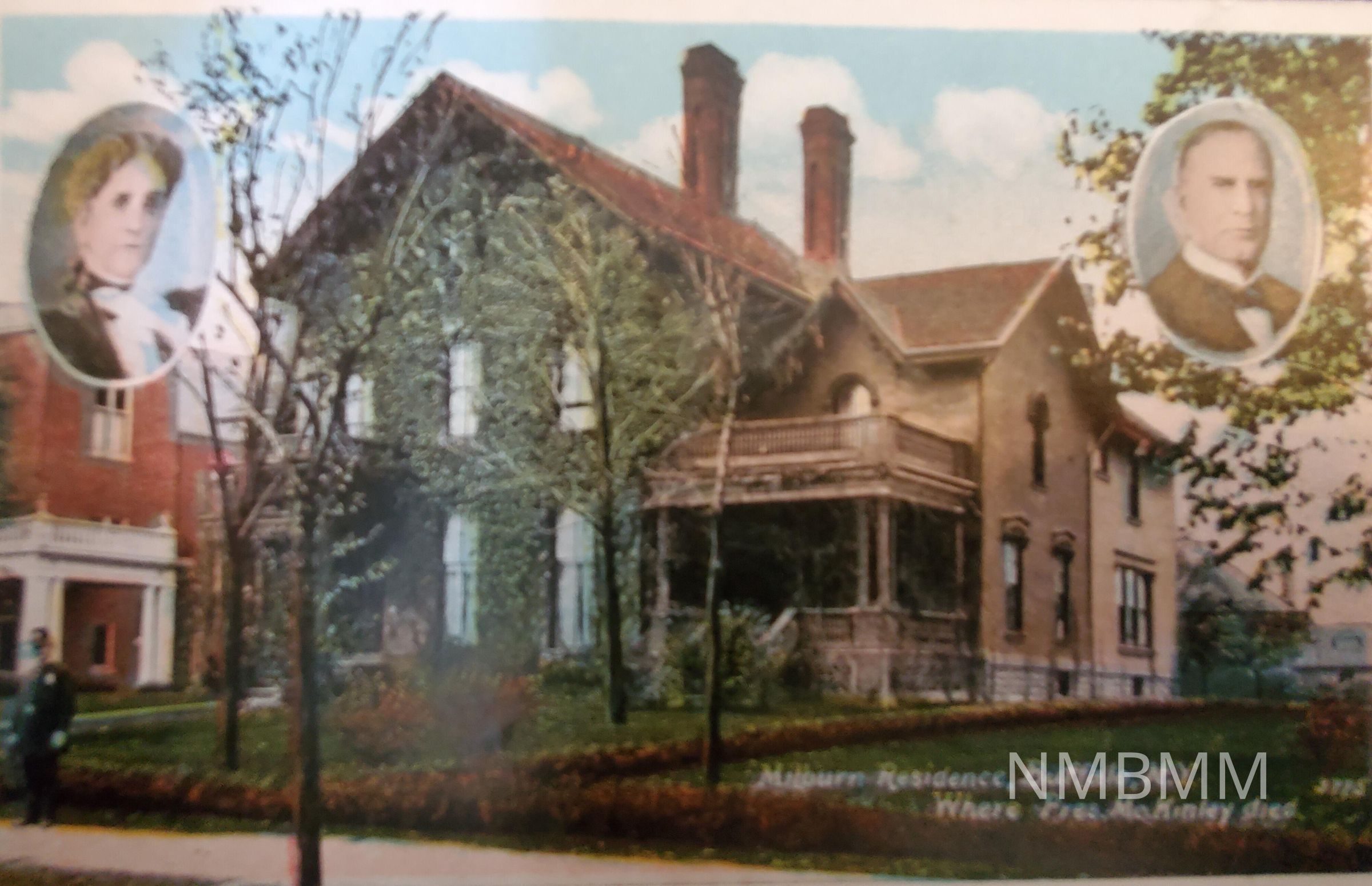 Postcard with a portrait of the Milburn home in Buffalo, NY where President McKinley died. The house is covered in ivy, and there is a portrait of President McKinley in the upper right hand corner, and a picture of Ida McKinley in the upper left hand corner.Collection