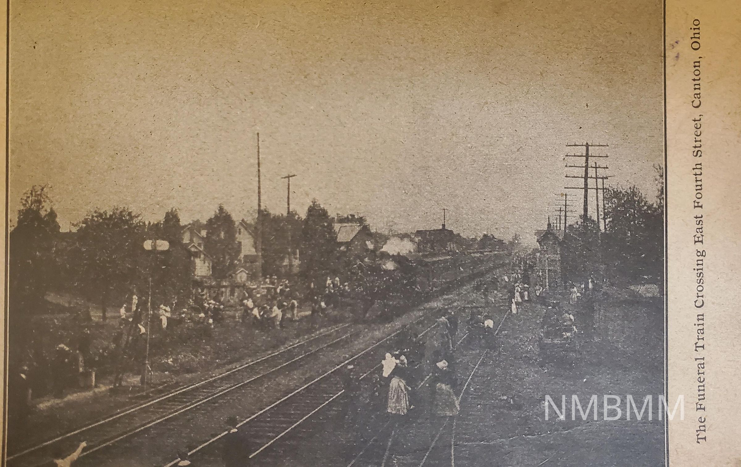 Postcard with a black and white image of President McKinley's funeral train on the tracks with crowd of mourners looking on. Text, "The Funeral Train Crossing East Fourth Street, Canton, Ohio."Collection