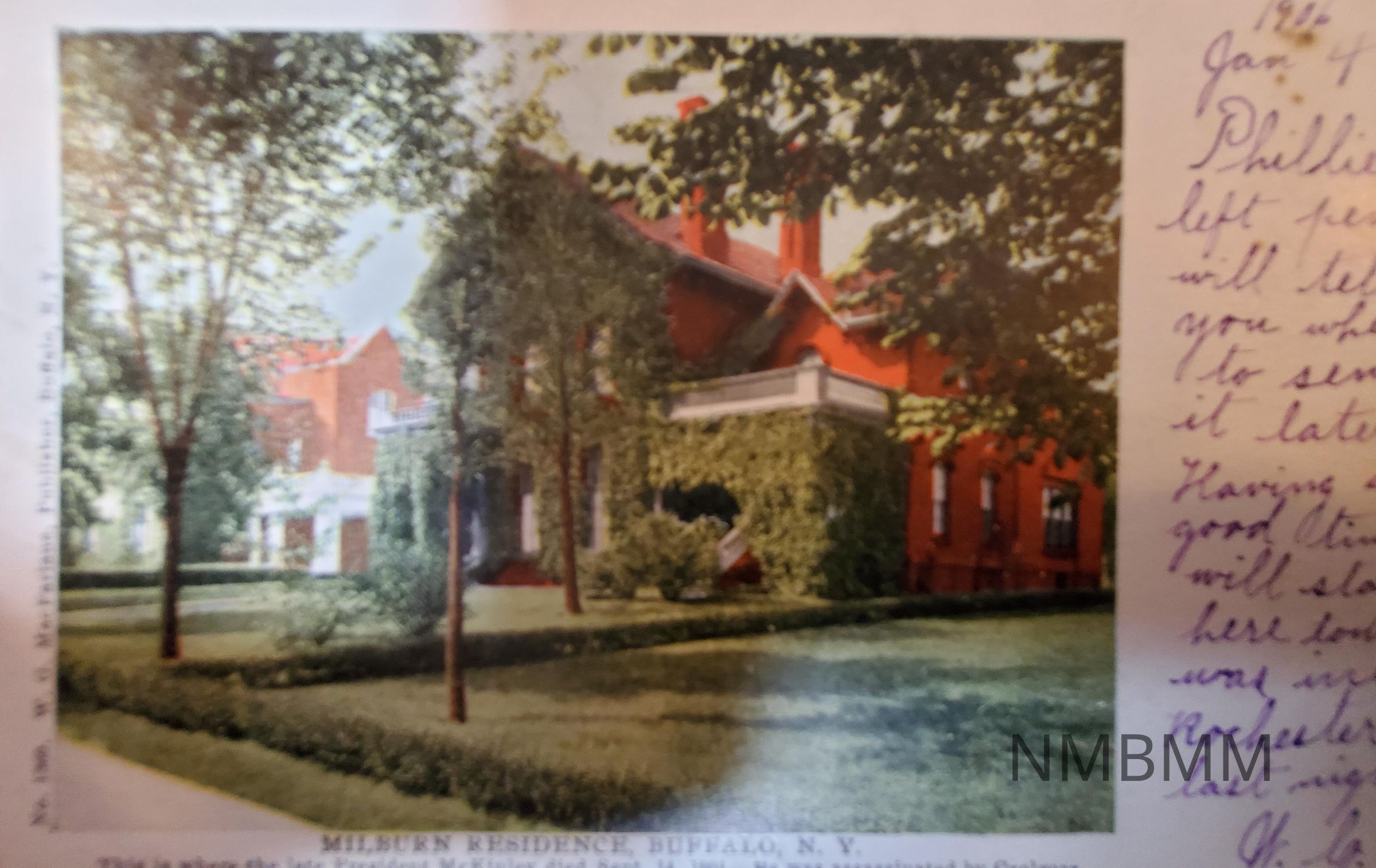 Postcard with a colored portrait of the Milburn home in Buffalo, NY where President McKinley died, with writing on the righthand side that reads: " 1906, Jan 4th- Phillie left pen. will tell you where to send it later. Having a god time, will stay here tonight was in Rochester last night, W. G." No. 1369 W.G. MacFarlane, Publisher, Buffalo, NY.Collection