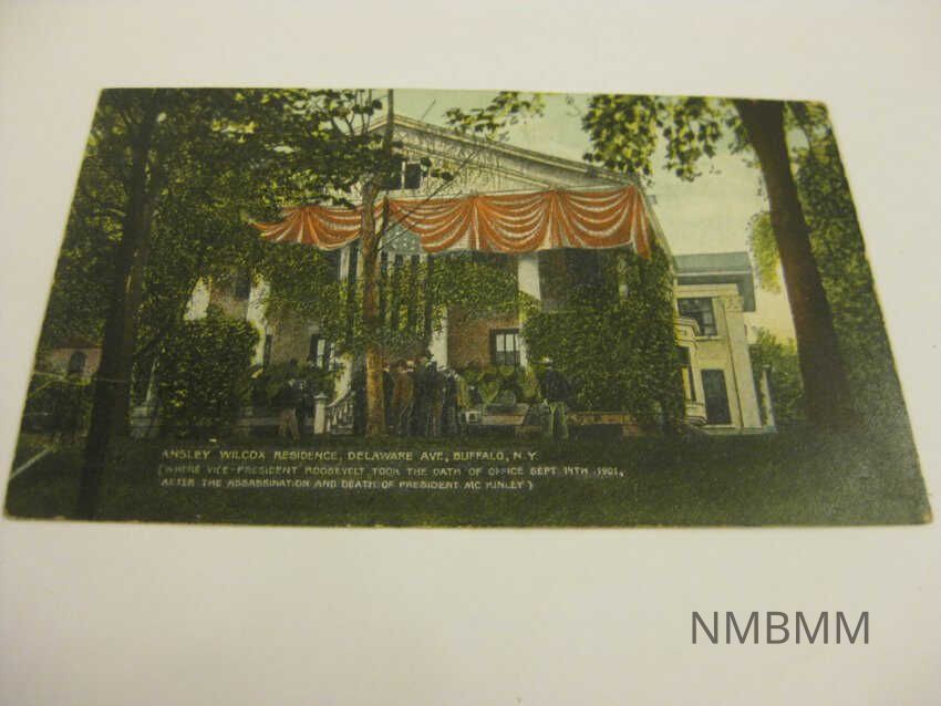 This item is a colored postcard of the Ansley Wilcox Residence, Delaware Ave, Buffalo, N.Y. The residence is white with pillars. There is an American flag anf fabric draped off the front of the house. There are men standing in front of the house. It is the residence that Vice-President Theodore Roosevelt took the oath of office on September 14, 1901 after President McKinley died from infection from injuries sustained by an assassination attempt. Made for S.H. Knox & Co.Collection