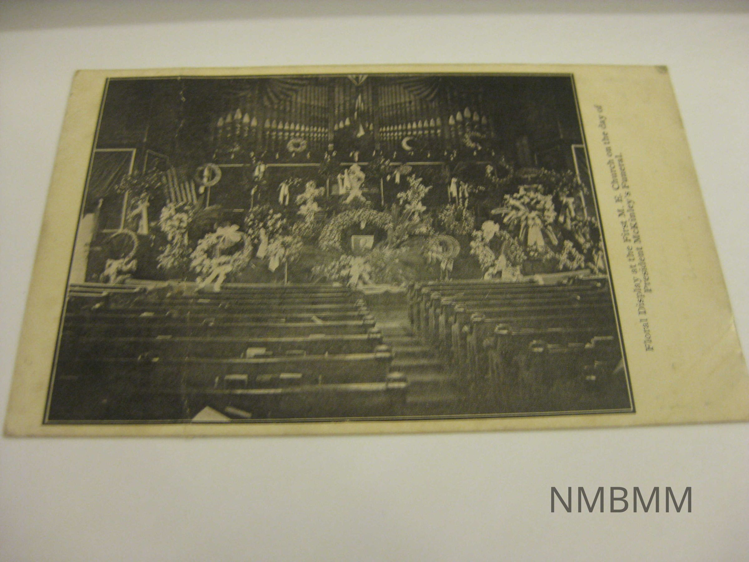 This item is a postcard with a black and white image of the inside of the First M.E. Church in Canton, Ohio. This is the church in which William McKinley's funeral services took place in September 1901. The postcard displays McKinley's funeral flowers.Collection