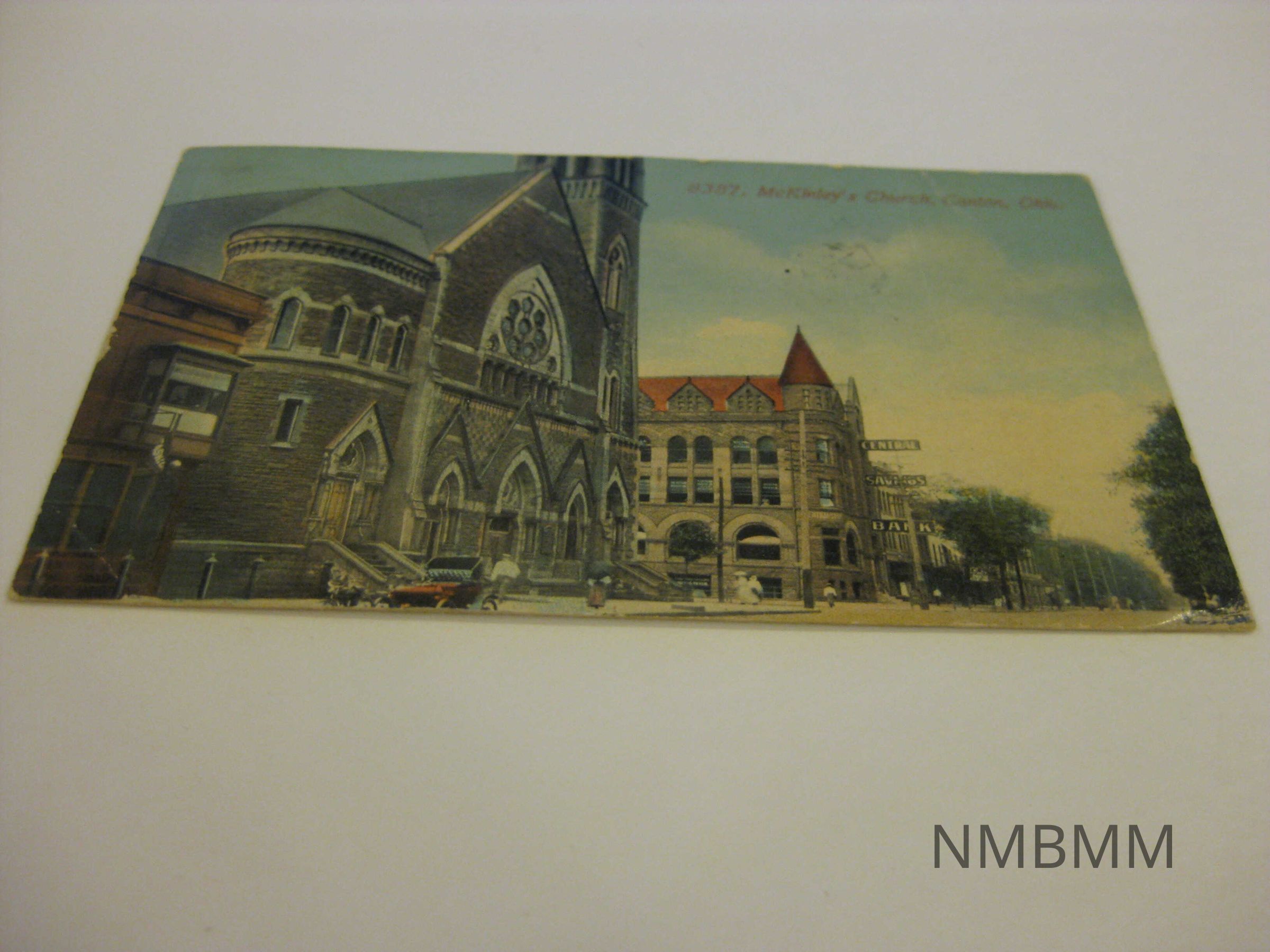 This item is a colored postcard with an image of a street view of the outside of the First M.E. Church in Canton, Ohio, Central Savings Bank, and people on the street. This is the church in which William McKinley's funeral services took place in September 1901. Back side text, Addressed to "Miss Mary L. [Hinkle] 721 E. Garwood Alliance O.." It has a postmark from Canton, Ohio 1914 and has a green one cent stamp of George Washington. Published by the Acmegraph Co. Chicago.Collection