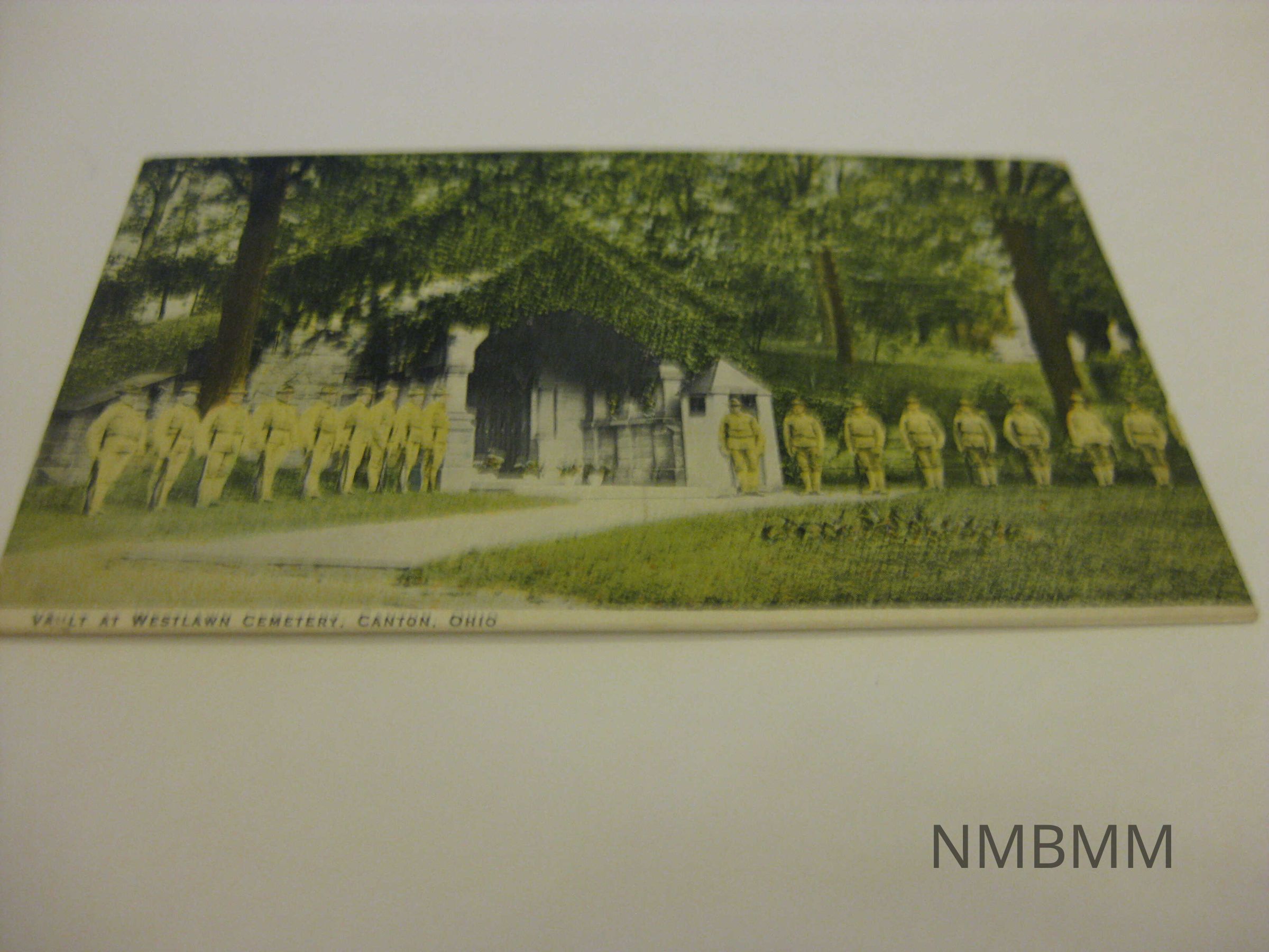 This item is a colored postcard with an image of President McKinley's vault in Canton, Ohio. There is a group of guards stationed in front of the vault. This vault was the original vault of President McKinley before his body was moved to the Canton memorial after construction. On the back, postcard has a one cent stamp of Benjamin Franklin. It has a postmark from Massillon, Ohio from Jan 15 1908. The postcard is addressed to, "Miss Ceridwen Thomas Massillon O. from Mrs. Barnes" It discusses not being able to make a lesson due to moving and wanting to reschedule the lesson at another time. Published for Kawin & Co., Chicago for S.H. Knox & Co., Canton, O.Collection