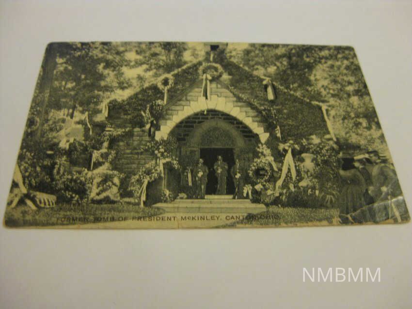 This item is a black and white postcard with a drawing of President McKinley's tomb in Canton, Ohio. There are guards stationed in front of the door to the tomb. The tomb is decorated in flowers. There are people standing in front of the tomb. This tomb was the original tomb of President McKinley before his body was moved to the Canton memorial after construction. On the back, postcard has some writing. Addressed to "Mrs. O.J. Stakes 1025. Walnut St. Canal Dover Ohio." Postmark is Wilmot Ohio Jan 31 1911. Printed in Germany. Split back for message and address. One cent stamp of Benjamin Franklin.