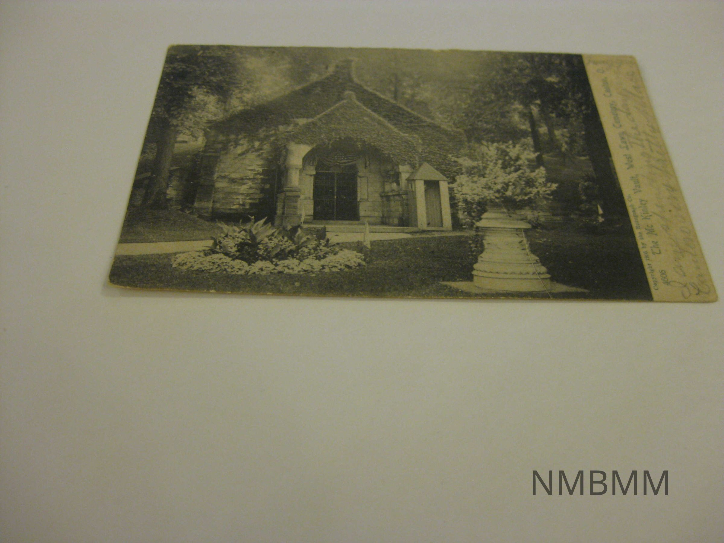 This item is a black and white postcard with an image of President McKinley's tomb in Canton, Ohio. This tomb was the original tomb of President McKinley before his body was moved to the Canton memorial after construction. There is a white text block on right side with text, "I am spending the day in Canton very pretty place. Maggie." Back side: The Rotograph Co., N.Y. City. (Germany). Postmarks of Canton, Ohio and Reading, Pennsylvania. Addressed to "Mrs. Wm. Snovel. 629 Moss St. Reading. Pa." Green one stamp Benjamin Franklin stamp.Collection