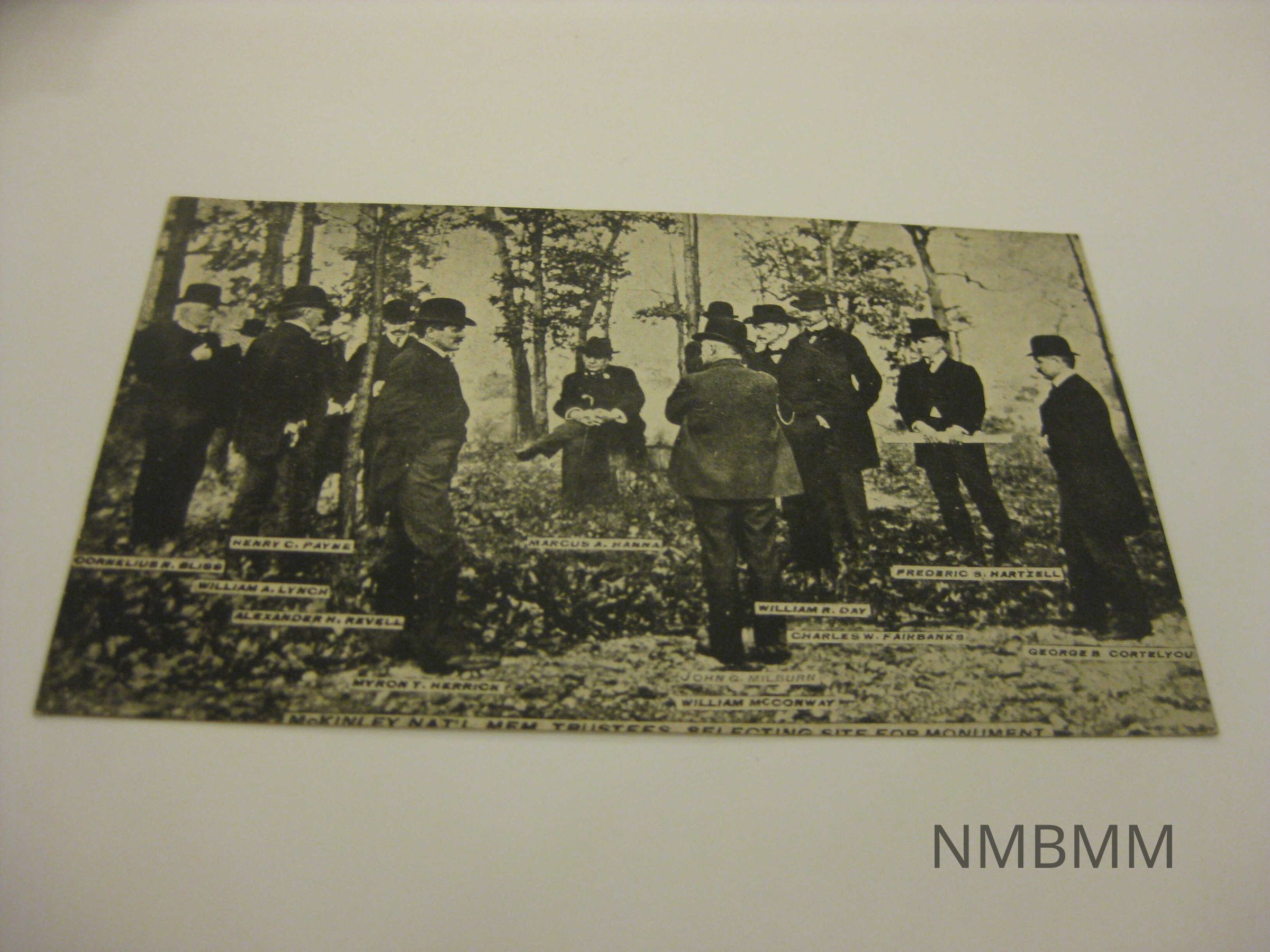 This item is a black and white postcard with an image of the McKinley Nat'l. Mem. Trustees, Selecting Site For Monument. Names are written under each man. Back side: C.G. Deuble, Canton, Ohio. Required a one cent stamp to mail.