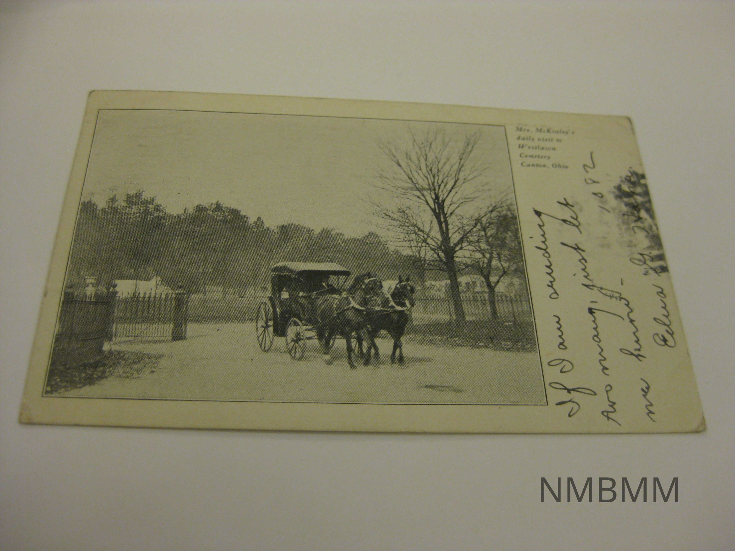 This item is a black and white postcard with an image of Ida McKinley in a horse drawn carriage visting President McKinley's tomb in Canton, Ohio. This tomb was the original tomb of President McKinley before his body was moved to the Canton memorial after construction. There is a white border around picture. Largest section on the border is on the right side. Back side: The Rolling Printing and Paper Co., Canton, Ohio-No. 3. One cent green Benjamin Franklin stamp. Addressed to H.H. Cummings of Box 364 Dover, N.H. 2 Postmarks one in Dover Oct. 9, 1906 and one in Canton Oct. 7, 1906.Collection