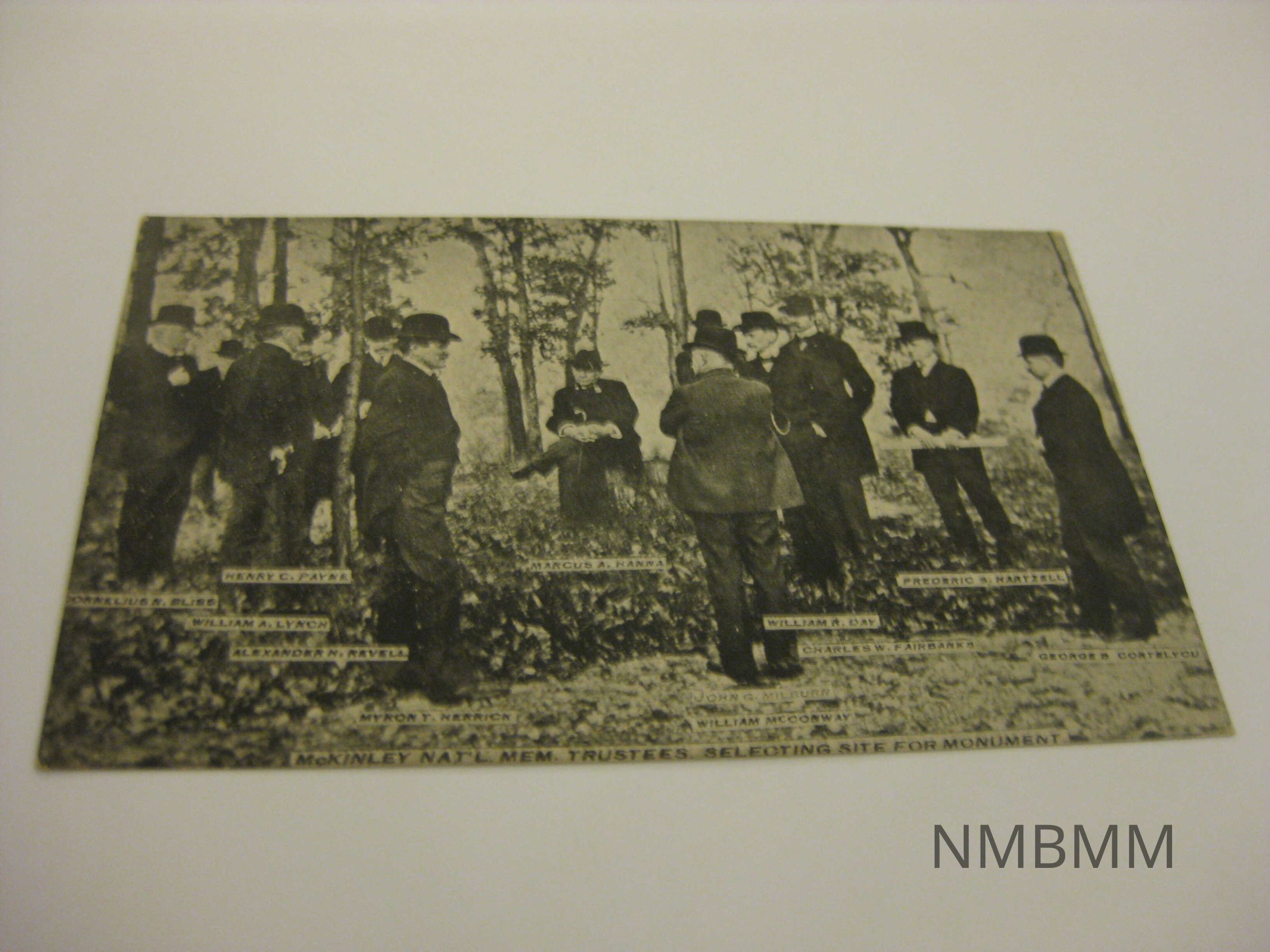 This item is a black and white postcard with an image of the McKinley Nat'l. Mem. Trustees, Selecting Site For Monument. Names are written under each man. Back side: C.G. Deuble, Canton, Ohio. Required a one cent stamp to mail.Collection
