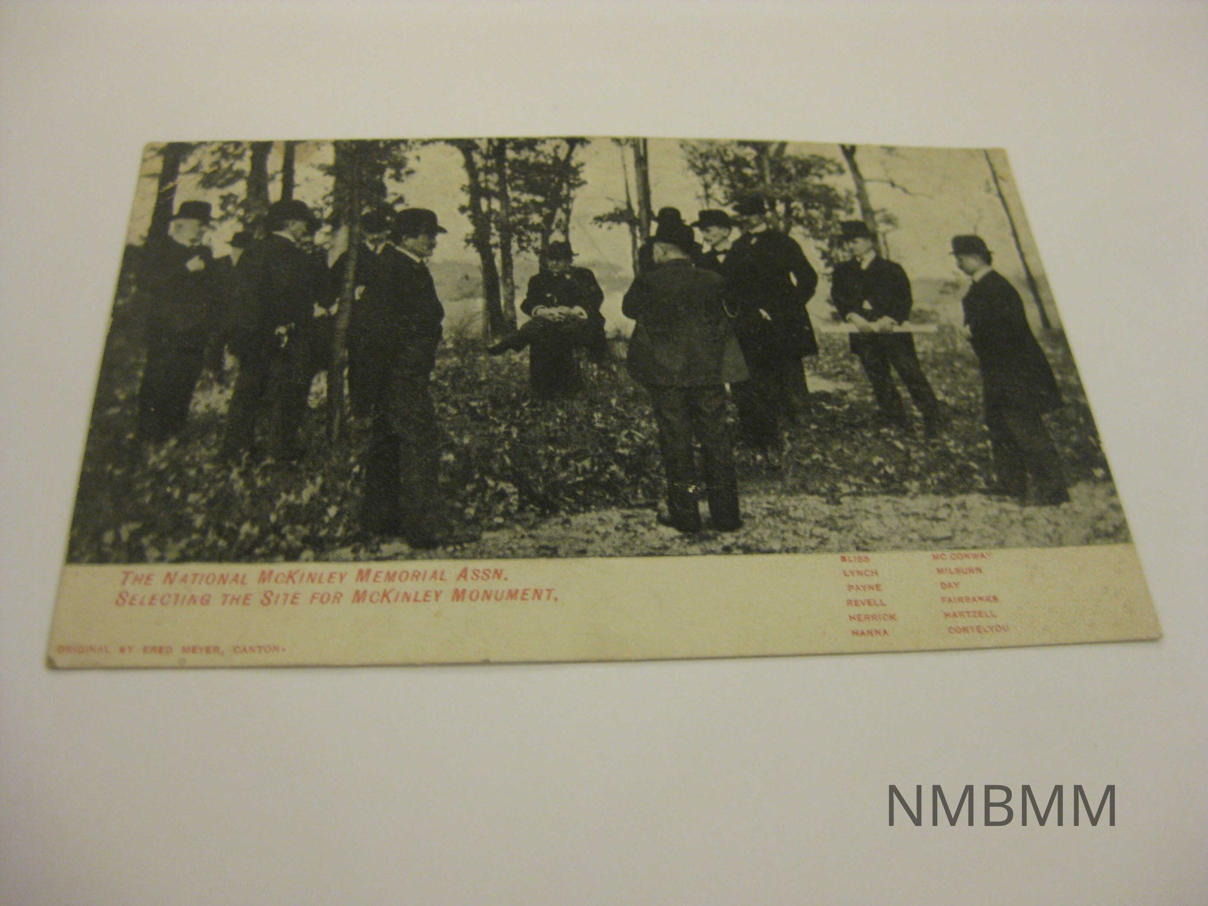This item is a black and white postcard with an image of The National McKinley Memorial Assn. Selecting the Site For McKinley Monument Names are written in red under picture. Original by Ered Meyer, Canton.Back side: Required a one cent stamp for domestic mailing.