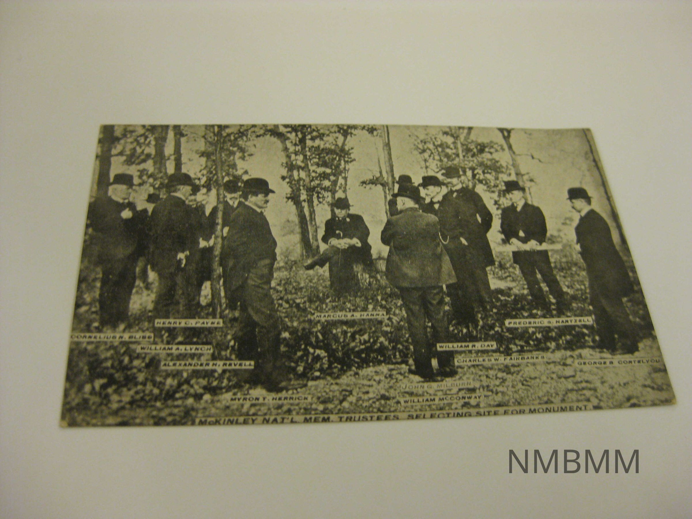 This item is a black and white postcard with an image of the McKinley Nat'l. Mem. Trustees, Selecting Site For Monument. Names are written under each man. Back side: C.G. Deuble, Canton, Ohio. Required a one cent stamp to mail.Collection