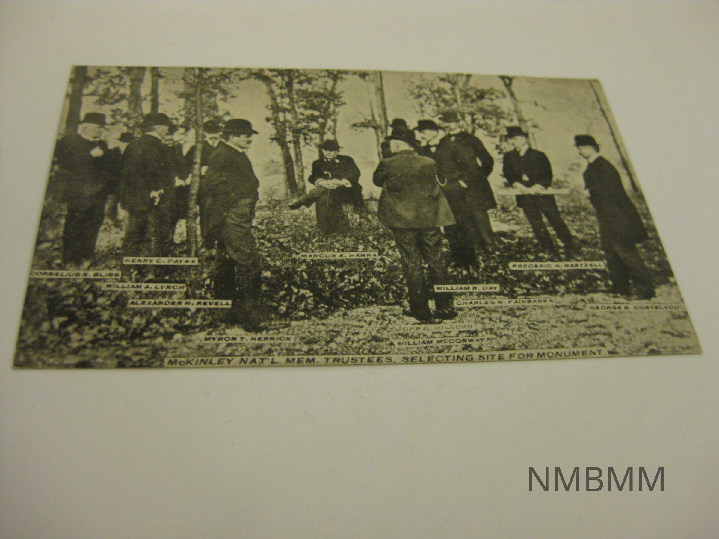 This item is a black and white postcard with an image of the McKinley Nat'l. Mem. Trustees, Selecting Site For Monument. Names are written under each man. Back side: C.G. Deuble, Canton, Ohio. Required a one cent stamp to mail.