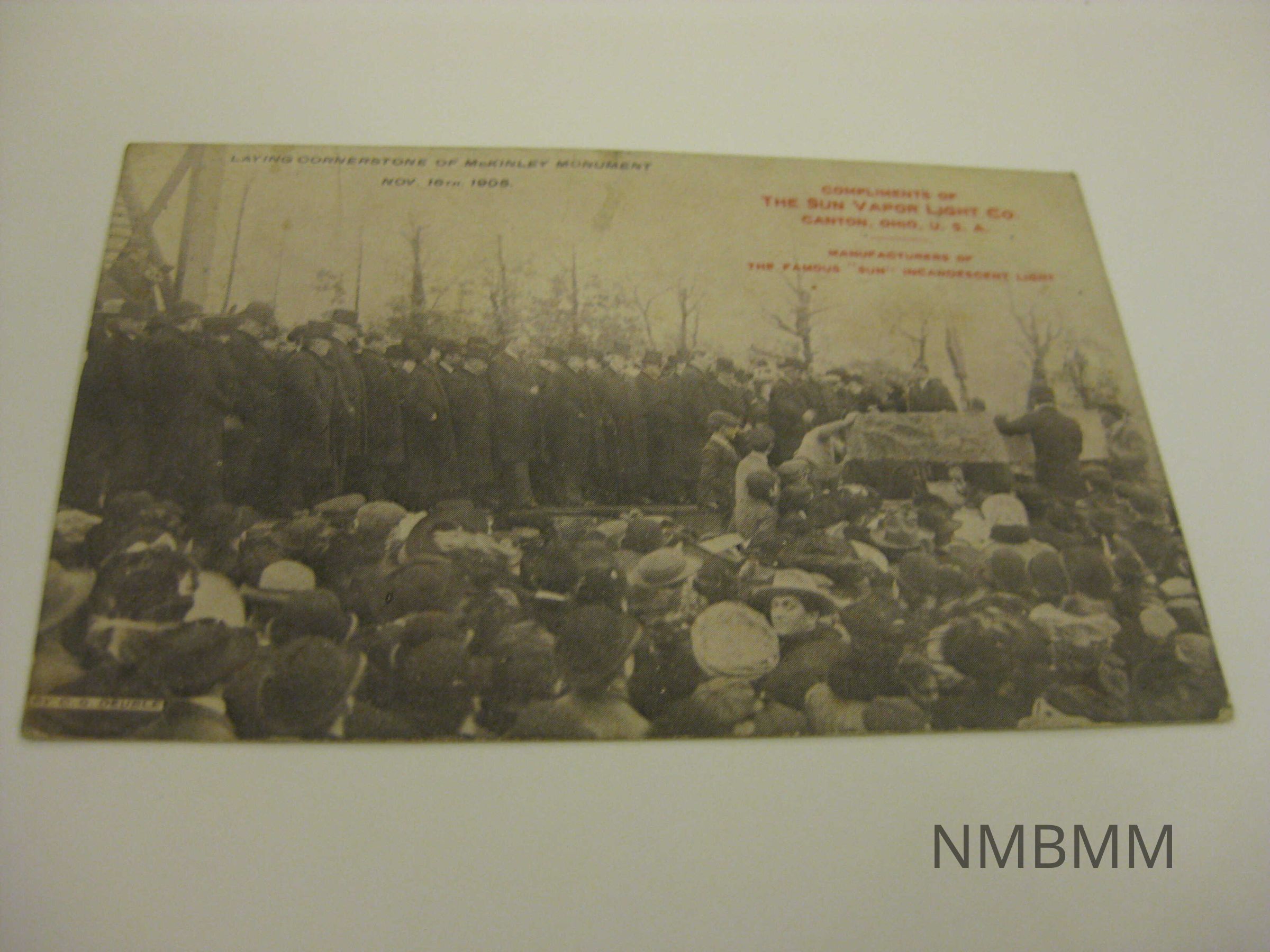 This item is a black and white postcard with an image of the laying of the cornerstone of the McKinley Monument. There is a crowd of people watching. Compliments of the Sun Vapor Light Co. Canton, Ohio, U.S.A. Manufacturers of the Famous "Sun" Incandescent Light. By C.G. Deuble, Canton, O. Back side: Required One cent stampCollection