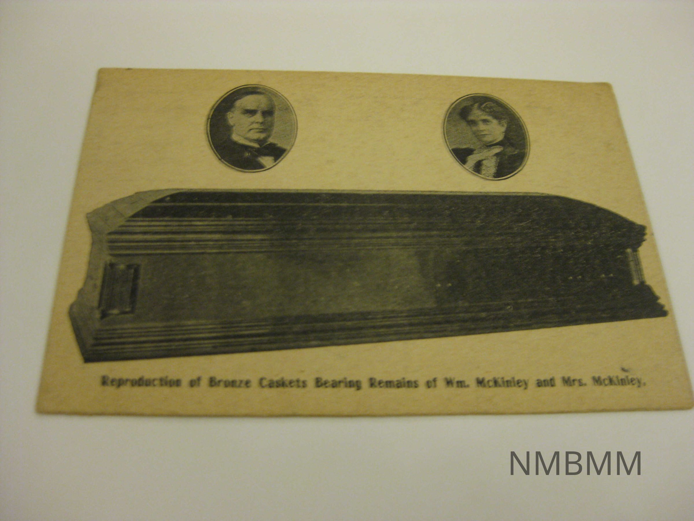 This item is a black and white postcard with two oval images, one of William McKinley and one of Ida McKinley above an image of a reproduction of a Bronze Casket Bearing Remains of Wm. and Mrs. McKinley. Split Back. Required one cent stamp to mail domestically.