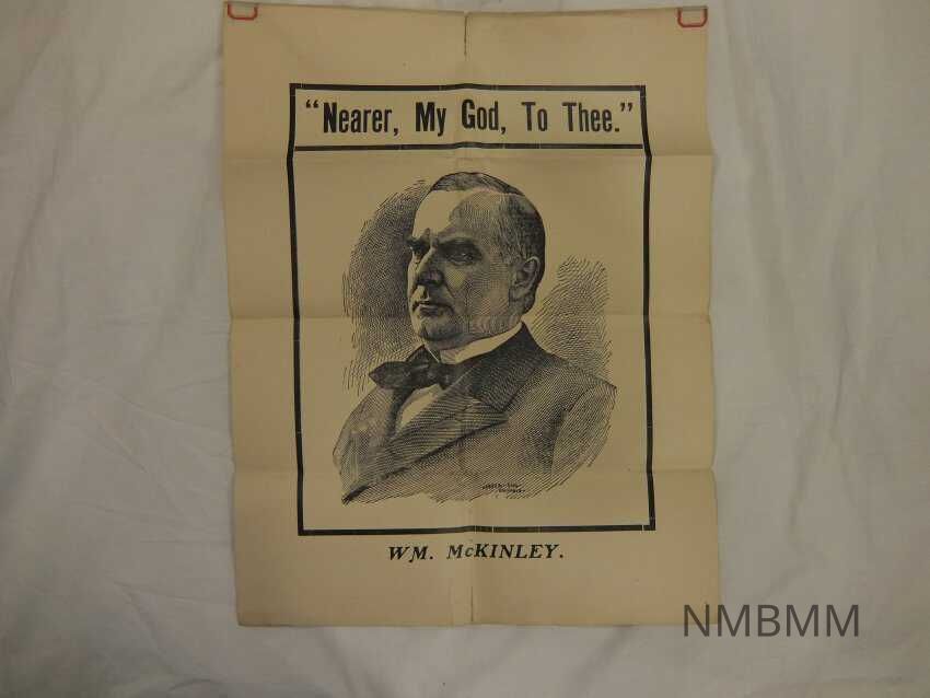 The item is a poster detailing the assassination of President McKinley, with a drawing of McKinley with the words "Nearer, My God, to Thee"; Harper- Eng.- Columbus.